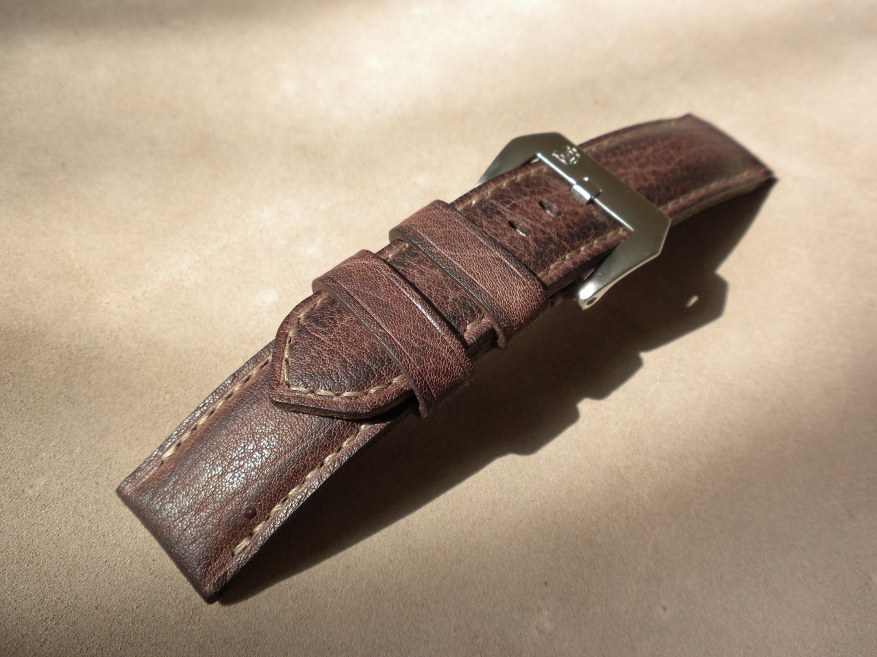 Ремешок из телячей кожи с эффектом старения 24/24 125/80 мм, по всей длине ремешка лежит небольшая подушка у основания она толще и имеет плавный спуск к дыркам.