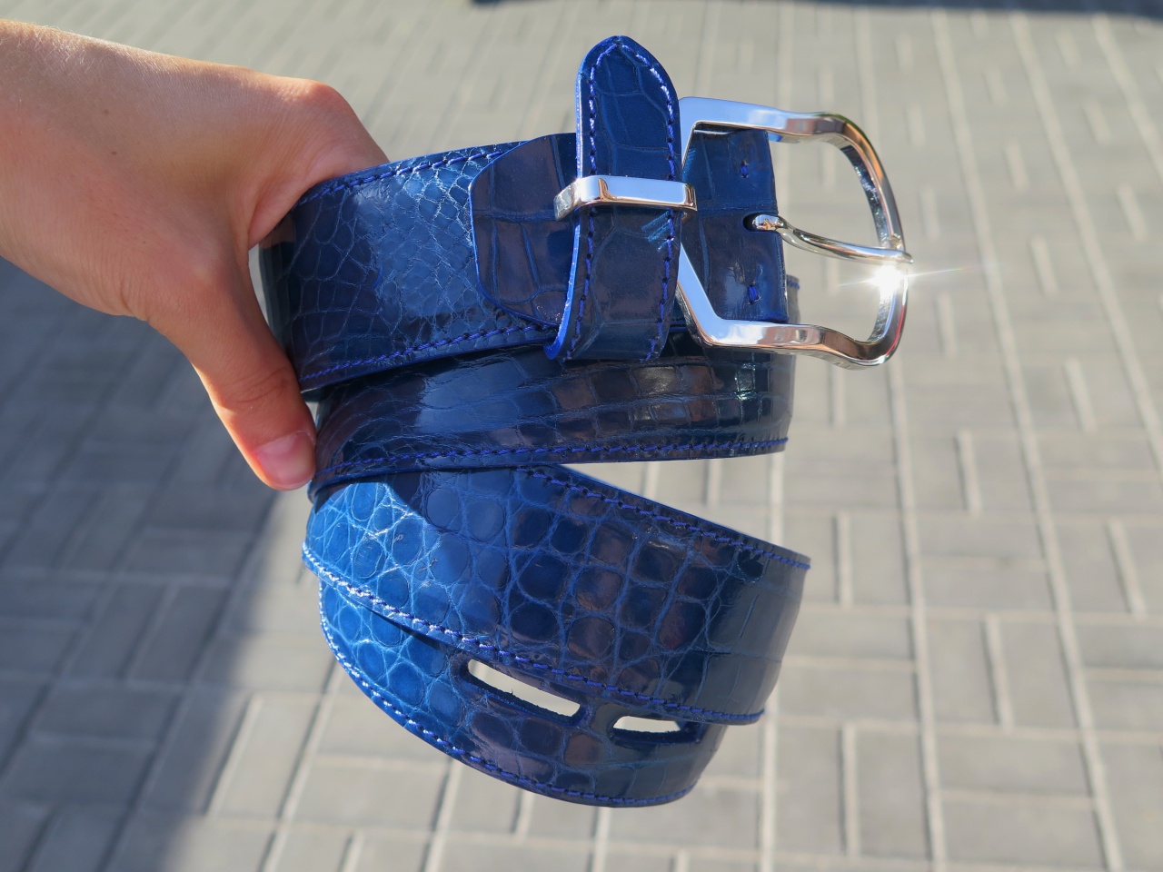 Яркий мужской ремень на лето из кожи аллигатора,цвет Королевский синий.