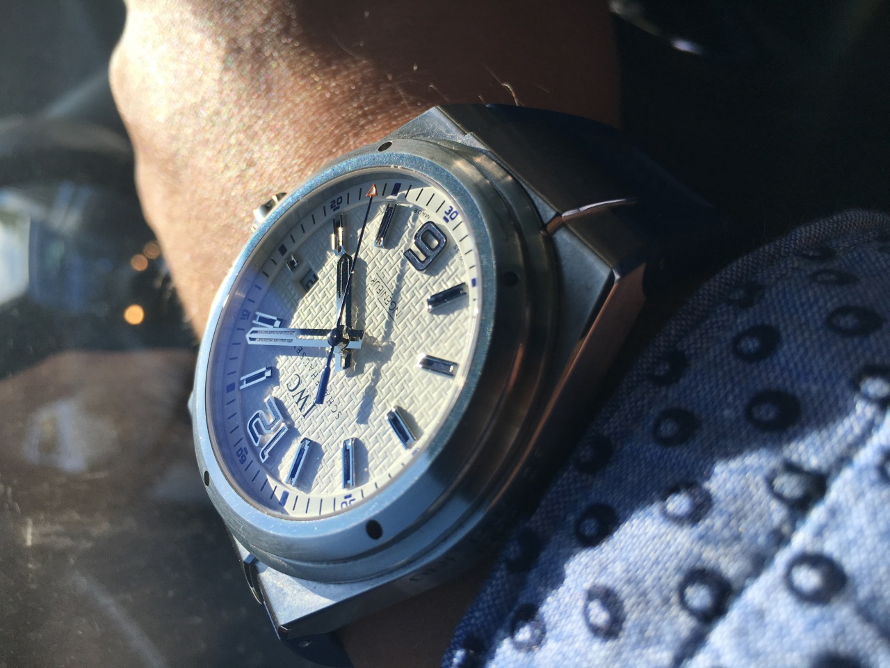 Изумительно красивый белый циферблат с накладными метками и цифрами, заслуженный механизм IWC 80110 на 28 камнях с автоподзаводом, каучук насыщенного синего цвета... Вообщем 46мм сплошного ПОЗИТИВА...