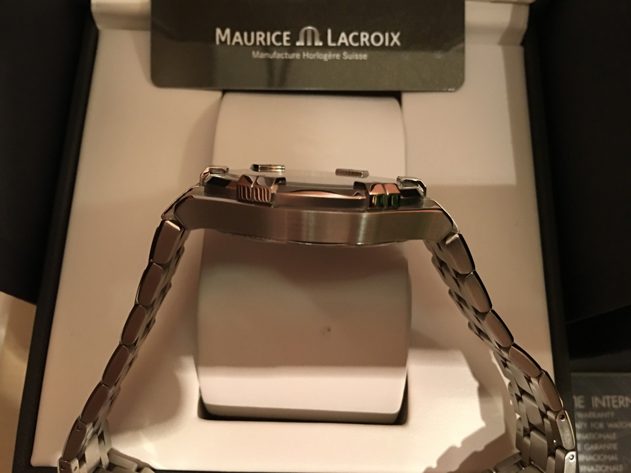 - Двойная раскладывающаяся застежка с кнопками, сатинированная и полированная отделка, круговое зернение