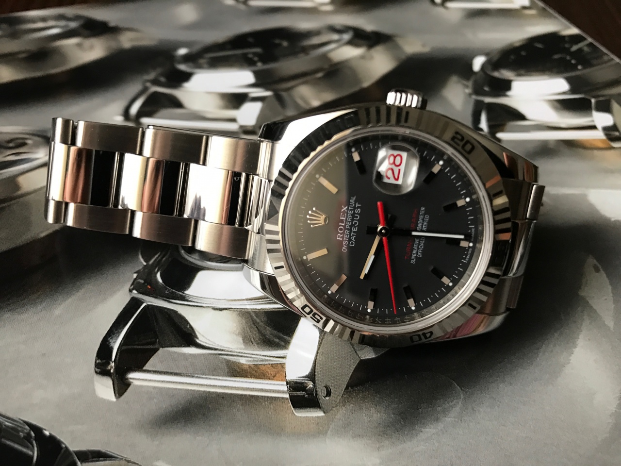 Циферблат: темно-серый, подписан "Turn-O-Graph" с красной секундной стрелкой, с золотыми накладными часовыми метками и часовыми стрелками, дата календаря на 3 часа под увеличительным стеклом.