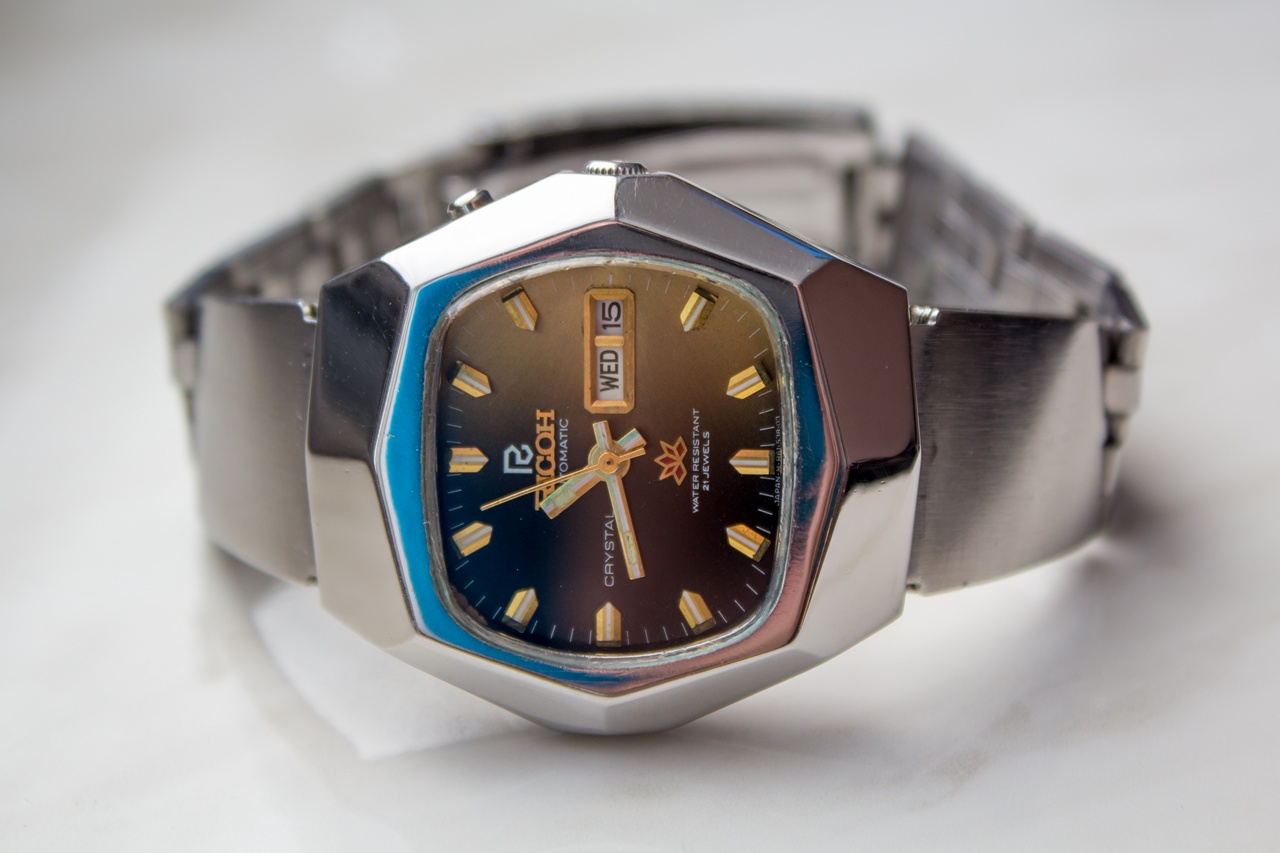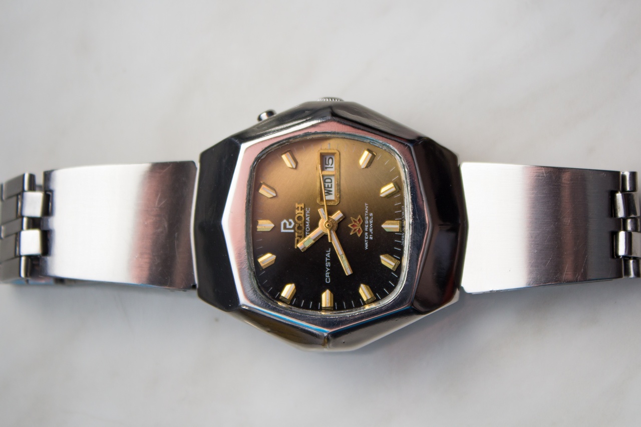 Всем доброго времени суток, сегодня речь пойдет о стареньких часах, для меня особенно дорогих, потому что принадлежали они моему отцу, который уже не с нами. Итак это автоматический Ricoh в массивном корпусе из нержавеющей стали. В 80-х годах минувшего века привезенные моим отцом из Афганистана, которые он некоторое время носил, а потом они вероятно сломались, отец пытался их починить, но очевидно безуспешно. После чего о часах забыли и они лежали глубоко в ящичке в виде кучки деталей в бумажном пакетика и корпусе без стекла.