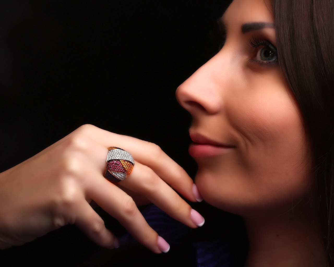 Кольцо усыпанное бриллиантами 1.30ct, сапфирами и рубинами