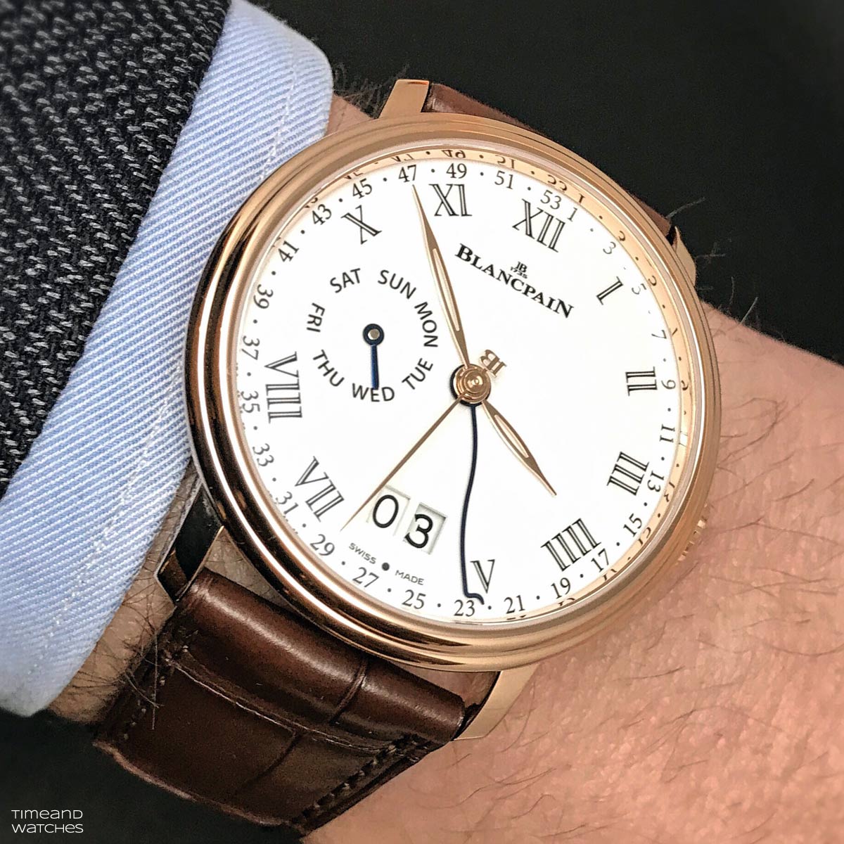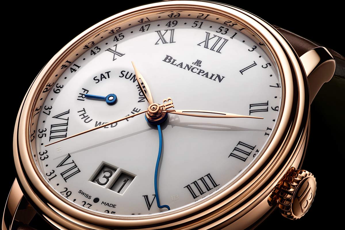 Круглый полированный корпус новинки, изготовленный из 18-каратного розового золота, диаметром 42,0 мм, толщиной 13,4 мм, водонепроницаемый до 30 метров. На торце рифленой заводной головки, расположенной на 3 часах, выгравировано изображение логотипа бренда Blancpain. Сапфировое стекло установлено на передней стороне часового корпуса (с антибликовым покрытием) и на его задней крышке. Циферблат покрыт эмалью белого цвета с черной разметкой и с золотыми стрелками (в том числе часовой и минутной - скелетонизированными, выполненными в листьевидной форме). Модель оснащена мануфактурным швейцарским автоматическим механизмом 3738G2, состоящим из 378 деталей, с тремя барабанами автоподзавода, обеспечивающими восьмидневный запас хода, функциями индикации часов, минут, секунд (посредством соответствующих центральных стрелок), даты (посредством соответствующего цифрового указателя в спаренных прямоугольных апертурах, расположенных на 6 часах), дня недели (на соответствующем круглом аналоговом указателе с буквенной разметкой и с вороненой стрелкой), а также порядковый номер недели в году (посредством змеевидной центральной вороненой стрелки на круглой шкале, размеченной арабскими цифрами и расположенной на периферии циферблата). Калибр отменно отделан и декорирован.