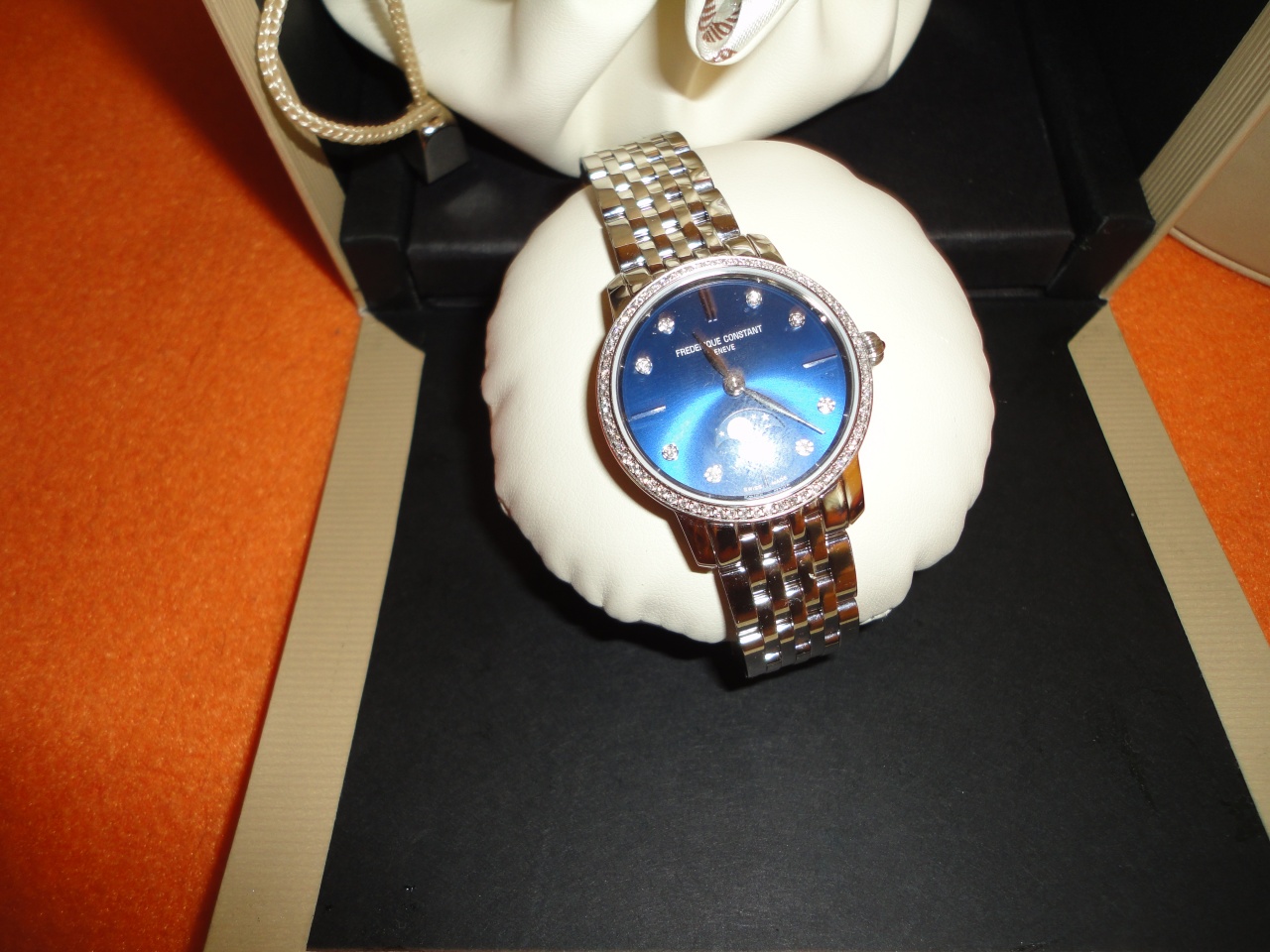 Это великолепные женские часы. Материал корпуса часов — сталь. В этих часах используется сапфировое стекло. Водозащита этих часов 30 м. В этой модели используются такие усложнения как фаза луны. Диаметр корпуса часов составляет 30мм. Данная модель украшена бриллиантами.