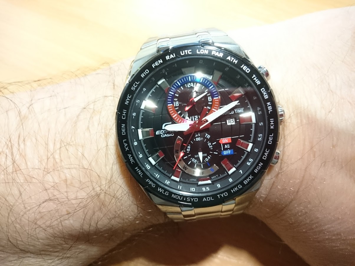 Вдруг, внезапно, потянуло на кварц... И захотелось, чтоб большие и хронограф и, самое главное, чтоб недорого. Стал смотреть Эдифайсы ( Сейки и Ситизен или маленькие, или не бюджетно). Сходил в магаз, поглядел вживую, оказалось, много моделей откровенно мелких, там вообще ничего не видать. Понял, что минимум диаметр должен быть 47 мм, обязательно чёрный безель ( белый уменьшает, имхо). Сильно понравились по картинкам EFR-550D - напомнили недосягаемые UN.На ebay с нынешним курсом руБля на эту модель цены не весёлые. Стал искать Яндексом, но помог империалистический Гугл. В Москве, в одном магазине, в котором я бы и не стал искать часы, был выбор из линейки EFR-550 ( даже синие RB) по гуманной цене. Купил.