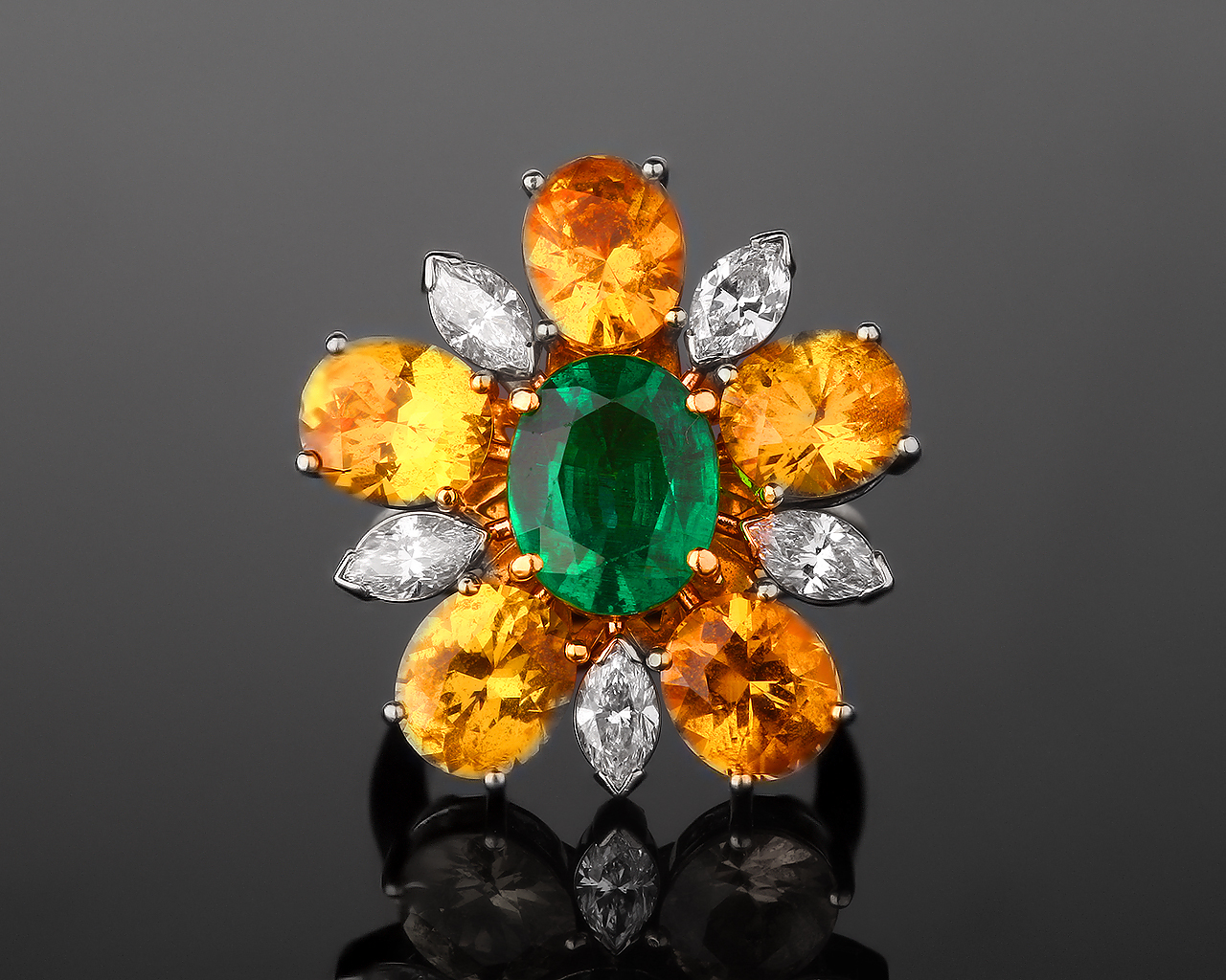 Яркое бриллиантовое кольцо с сапфирами и изумрудом