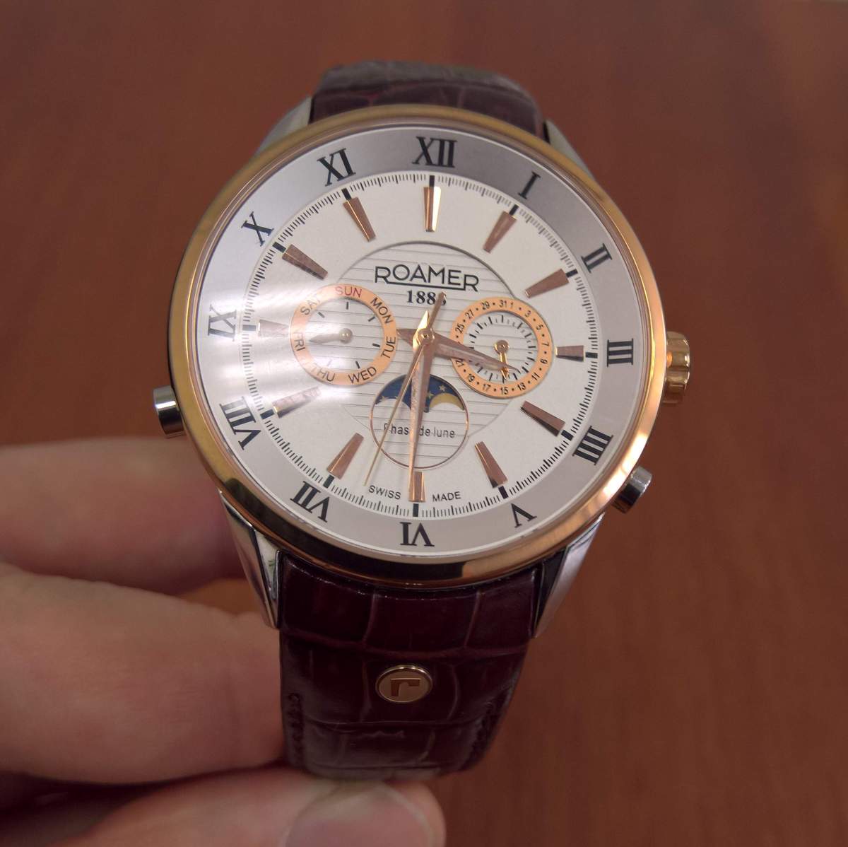 Дополнительный циферблат с изображением фаз Луны и градуировкой на 29,5 суток (продолжительность лунного месяца). Индикатор показывает, как выглядит Луна (светлая часть индикатора) в полдень в Северном полушарии.