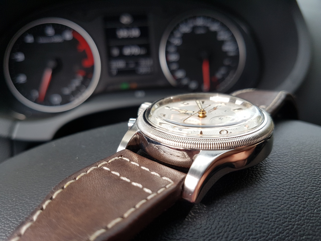 Хронограф, с рифленым безелем, с выпуклым стеклом, с невероятно красивыми золотыми стрелками и накладными метками, красивым винтажным гильеше и в размере 42мм с крупной головкой.