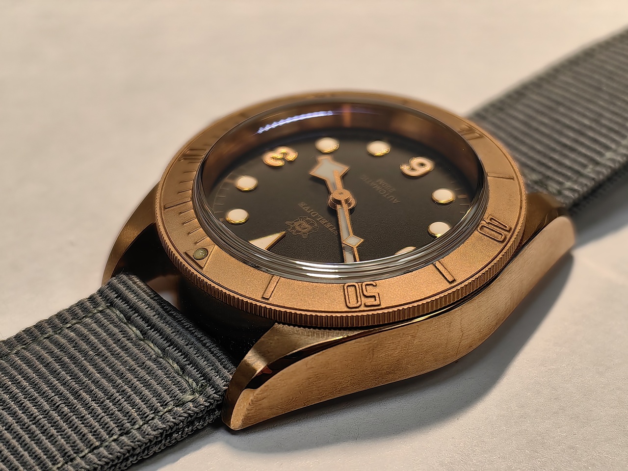Эти часы уже долго лежали в моей корзине на Алиэкспрессе, и были в числе покупок "на потом" как завершающие череду бронзовых хомажей Тюдор. Причиной откладывания покупки была вовсе не цена, а немного сомнительный внешний вид, а именно безель. В моделях от Тюдор безель цветной(коричневый, черный) - у Стилдайва он бронзовый(что неплохо), но какой-то скучный. Терзаясь сомнениями я всё таки сделал заказ, - уж лучше выяснить всё окончательно, и закрыть вопрос.
