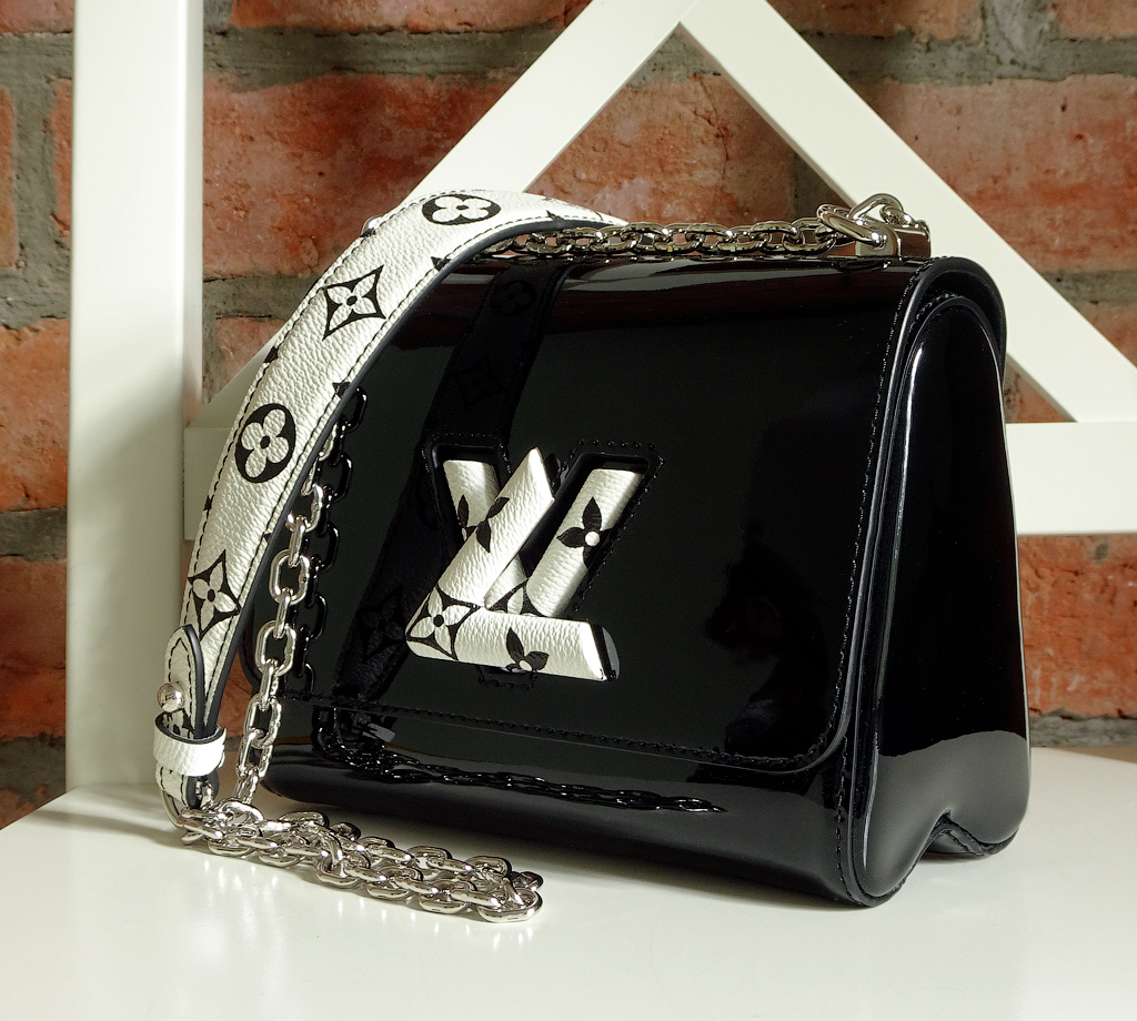 Особенность - сочетание черной лаковой кожи, с плечевой накладкой ремня и замком LV Twist из необычной канвы в уникальном контрастном окрасе - черно-белом!