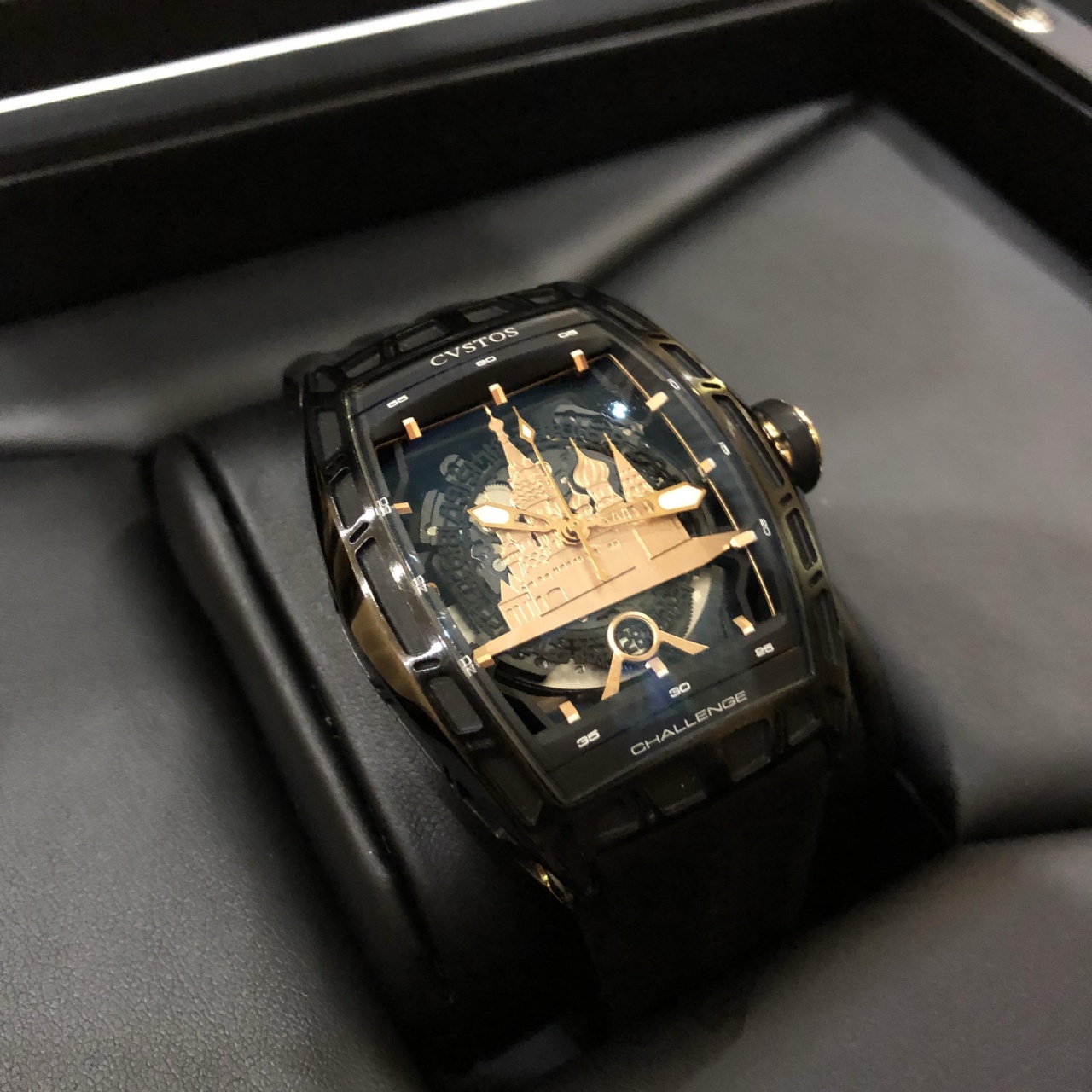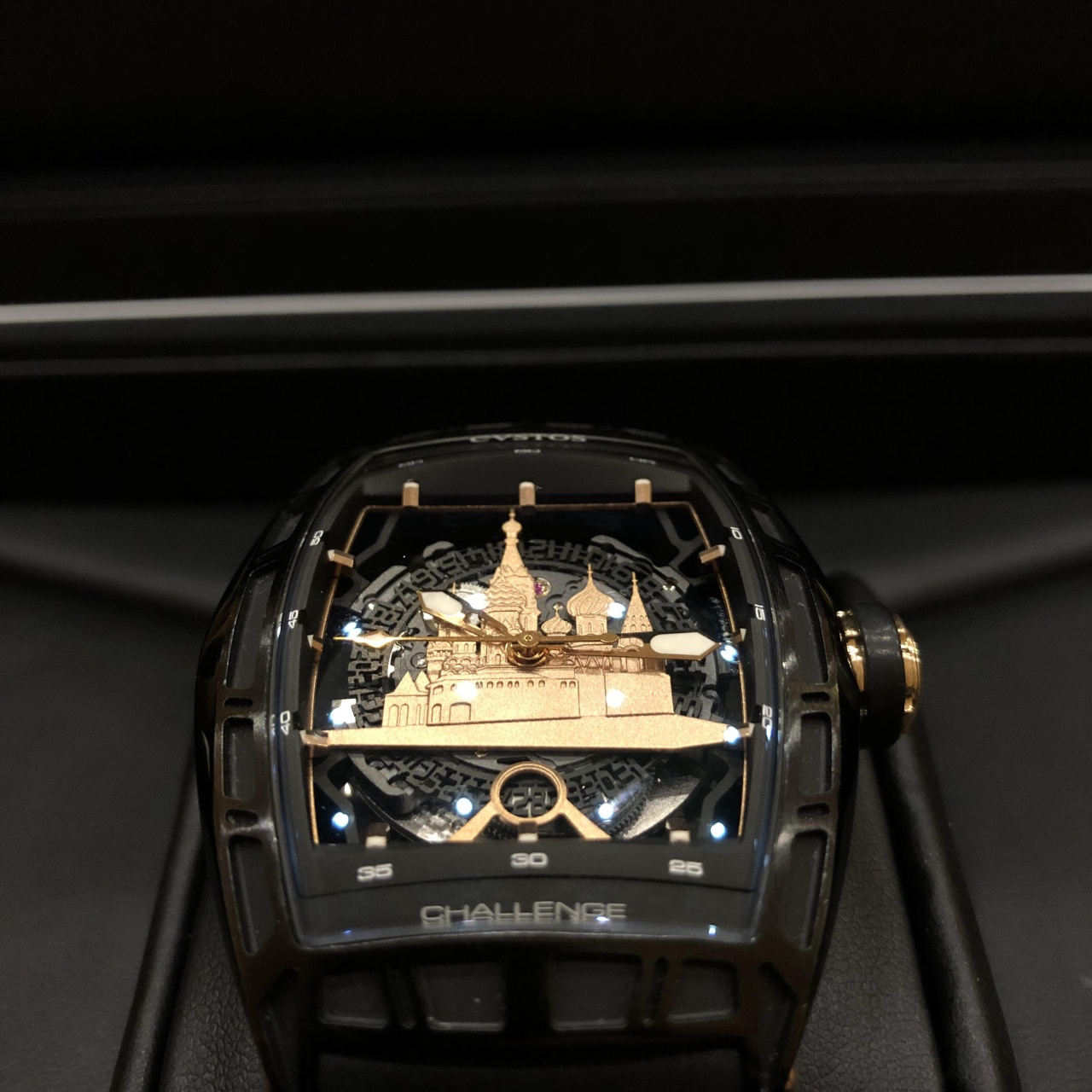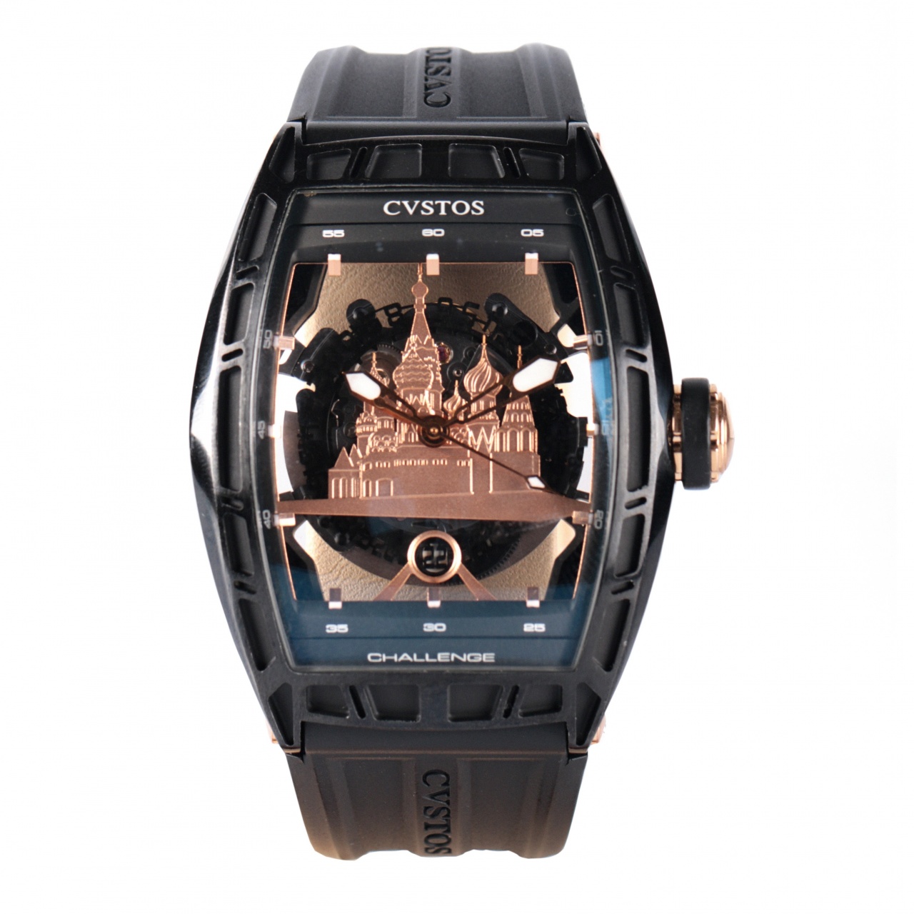 Мастера компании Cvstos полностью изменили функции мануфактурного механизма CVS 350, оснастив его безупречной системой автоподзавода. Ротор автоподзовода изготовлен из 2-х частей: вольфрамового груза и титанового рычага. Такая конфигурация неравномерного распределения веса в роторе позволяет устранить лишние вибрации и, таким образом, повысить эффективность завода часов. Обновленный уникальный калибр прошел полную модификацию: лишился всего лишнего и превратился в скелетон. Циферблат часов украшен силуэтом Красной Площади из розового золота и дополнен скелетонизированным диском даты.