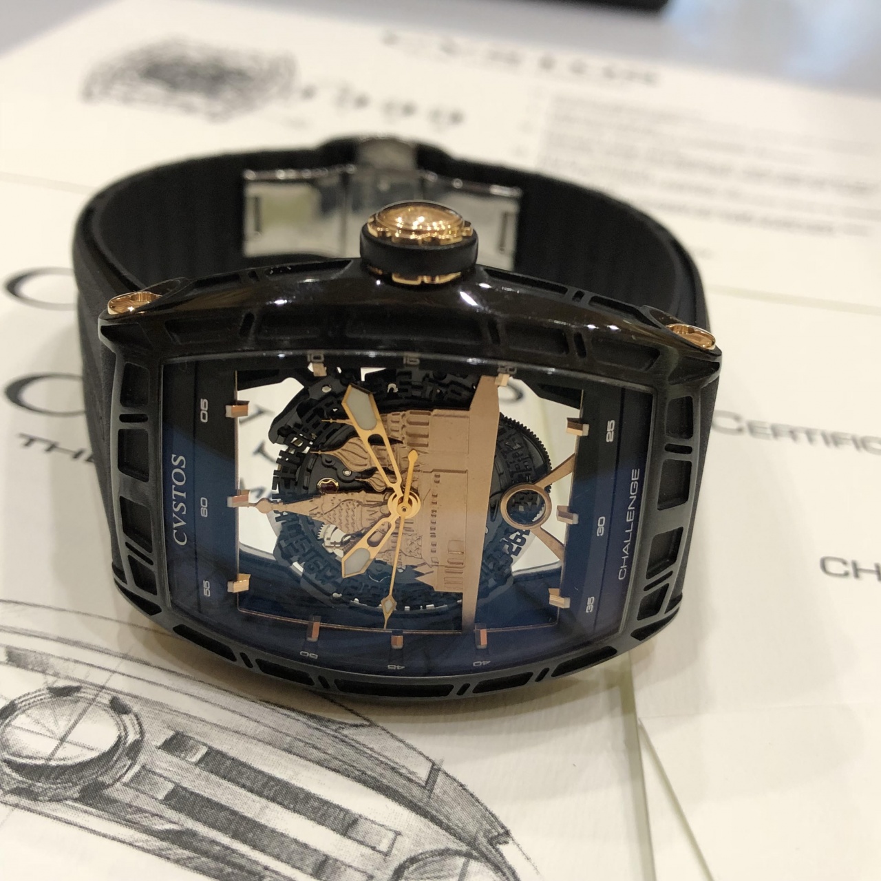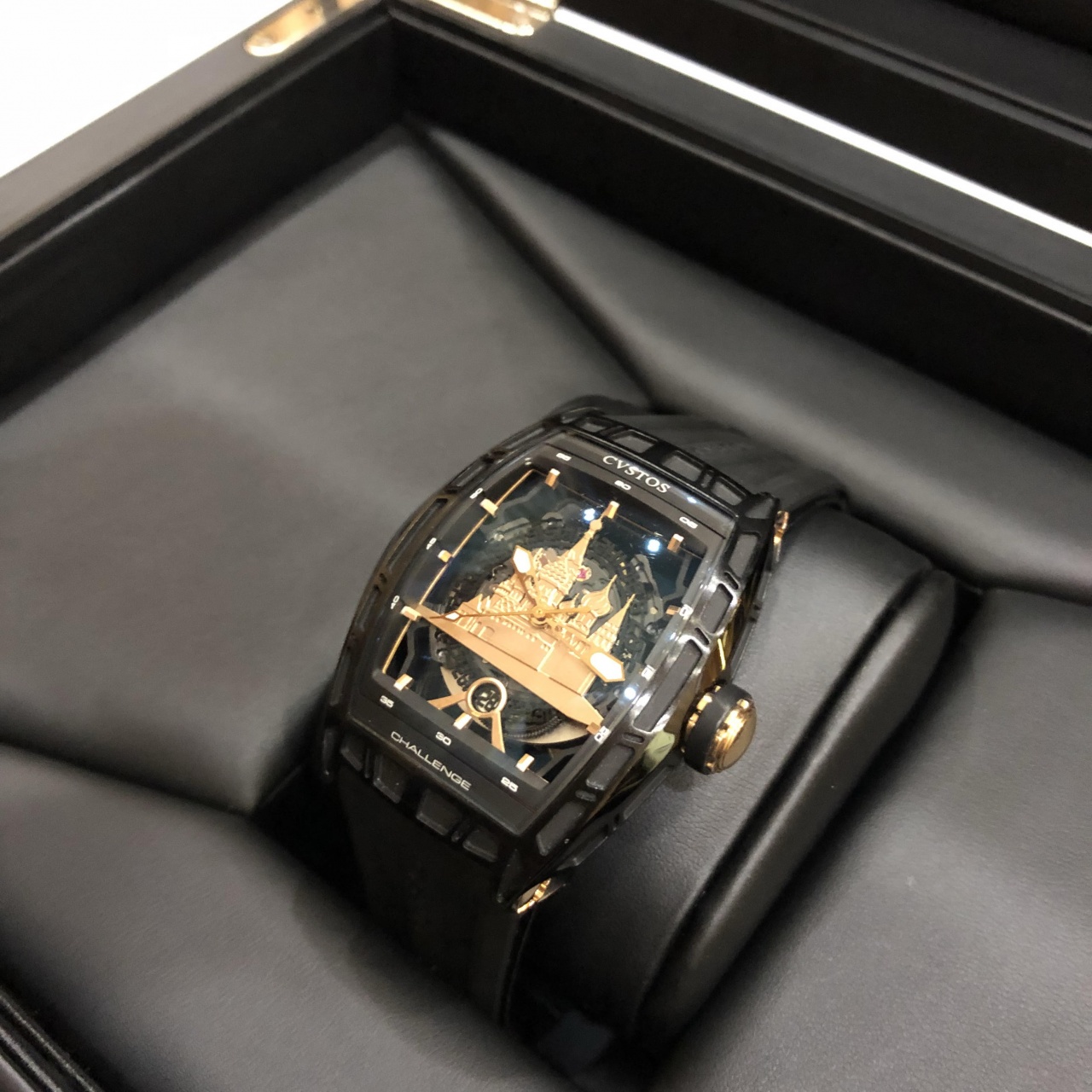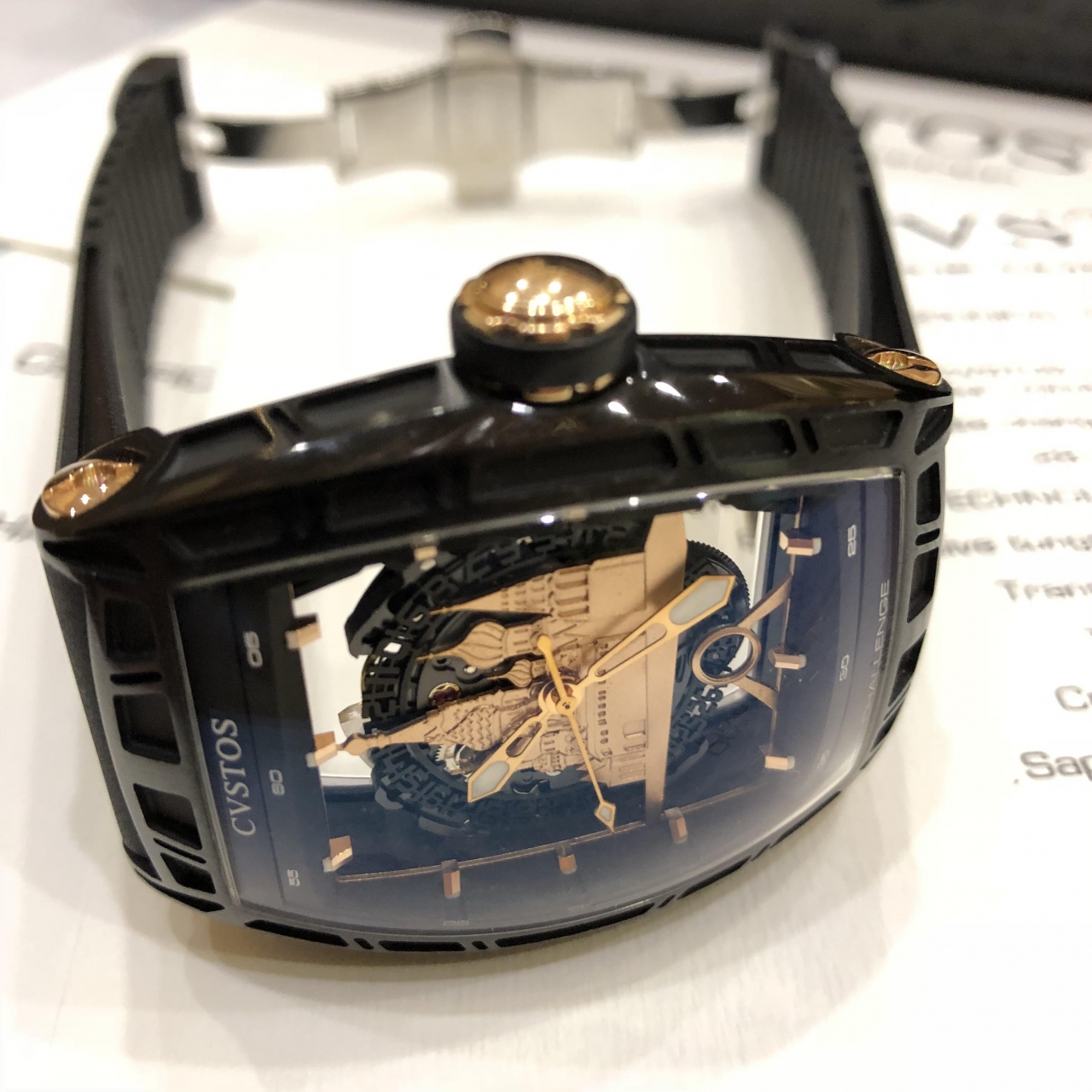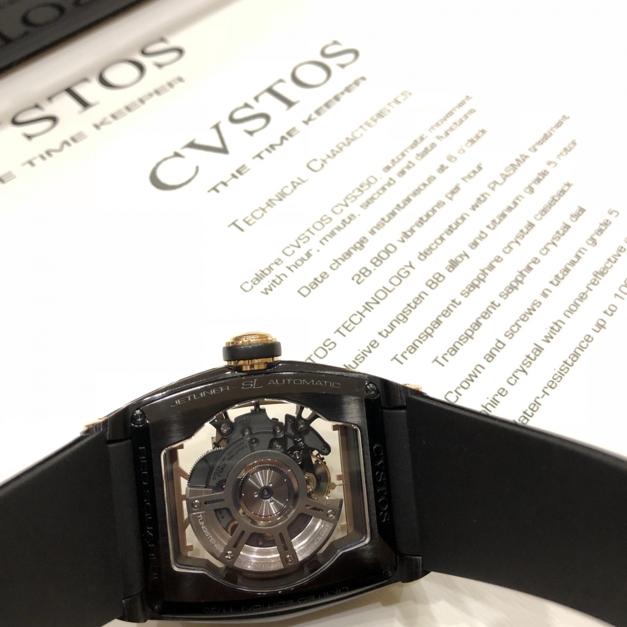 Мастера компании Cvstos полностью изменили функции мануфактурного механизма CVS 350, оснастив его безупречной системой автоподзавода. Ротор автоподзовода изготовлен из 2-х частей: вольфрамового груза и титанового рычага. Такая конфигурация неравномерного распределения веса в роторе позволяет устранить лишние вибрации и, таким образом, повысить эффективность завода часов. Обновленный уникальный калибр прошел полную модификацию: лишился всего лишнего и превратился в скелетон. Циферблат часов украшен силуэтом Красной Площади из розового золота и дополнен скелетонизированным диском даты.
