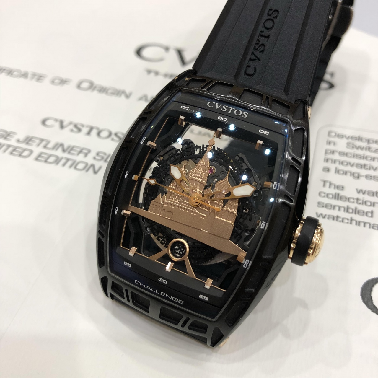Сохраняя лучшие традиции швейцарского часового искусства, Сассун Сирмейкес и Антонио Терранова, создали часы Cvstos Challenge Jetliner Red Square, своеобразную дань Красной Площади, символу не только Москвы, но и всей России. Часы Cvstos Challenge Jetliner Red Square выпущены лимитированной серией всего 20 экземпляров - очень редкие часы!