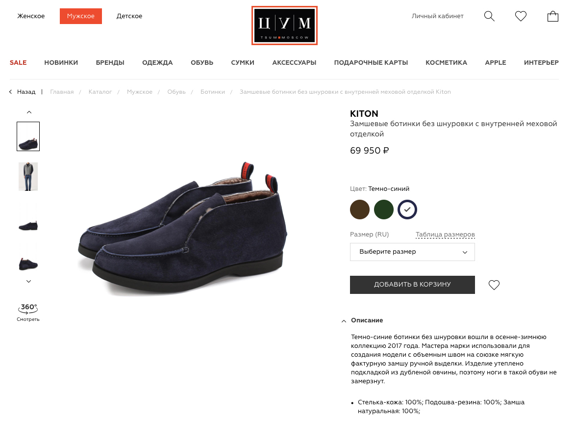 Темно-синие ботинки без шнуровки вошли в осенне-зимнюю коллекцию 2017/2018 года. Мастера марки Kiton использовали для создания модели с объемным швом на союзке мягкую фактурную замшу ручной выделки.
