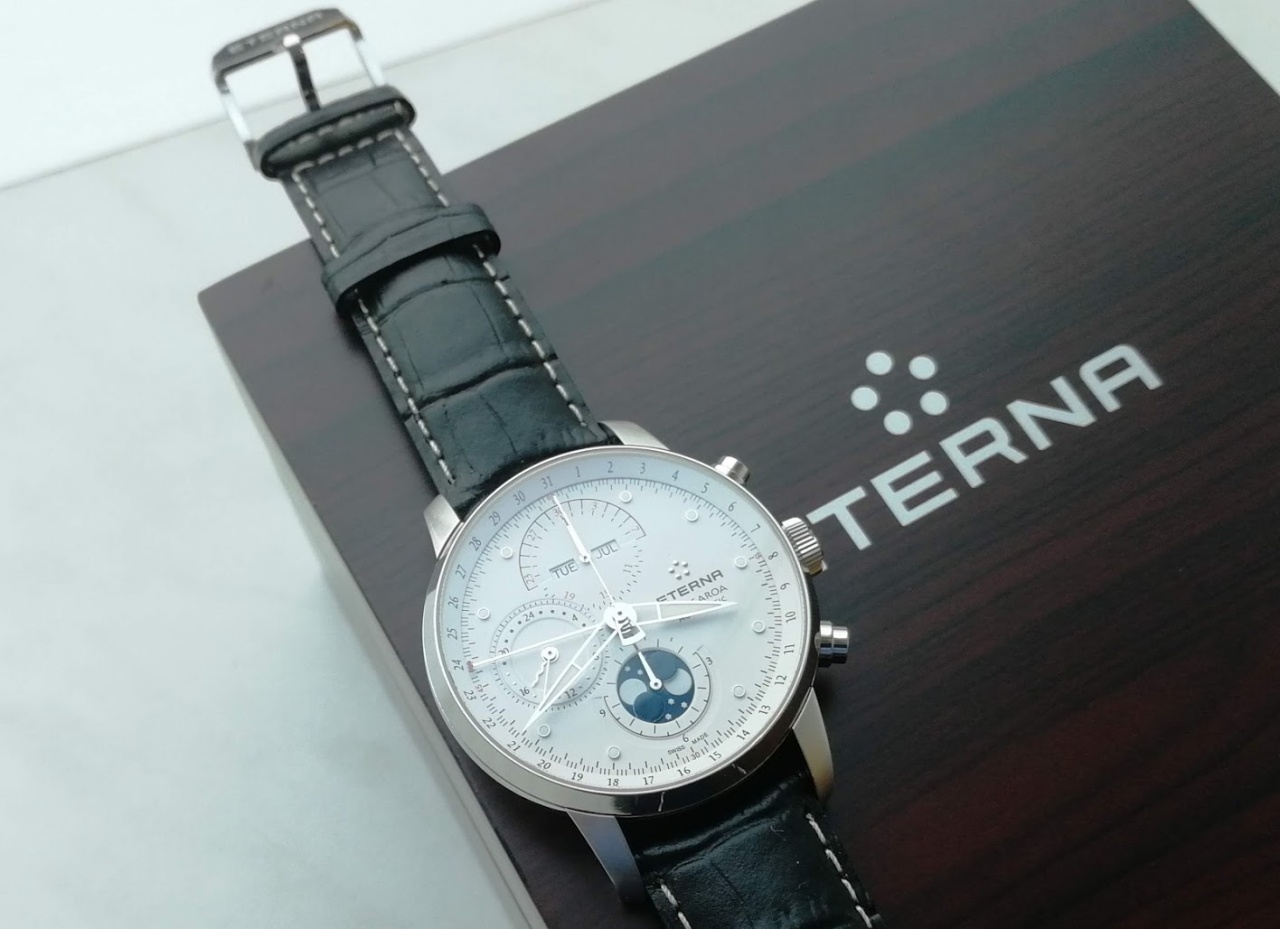 Предлагаю яркий и привлекающий внимание костюмник Eterna Tangaroa Moonphase. Механический хронограф на Valjoux 7751 c указателем фазы луны, дополнительным 24–часовым циферблатом, датой, месяцем и днем недели. Диаметр без ЗГ 42 мм, толщина 14 мм, оригинальный кожаный ремень, автоподзавод, водостойкость 50 метров.