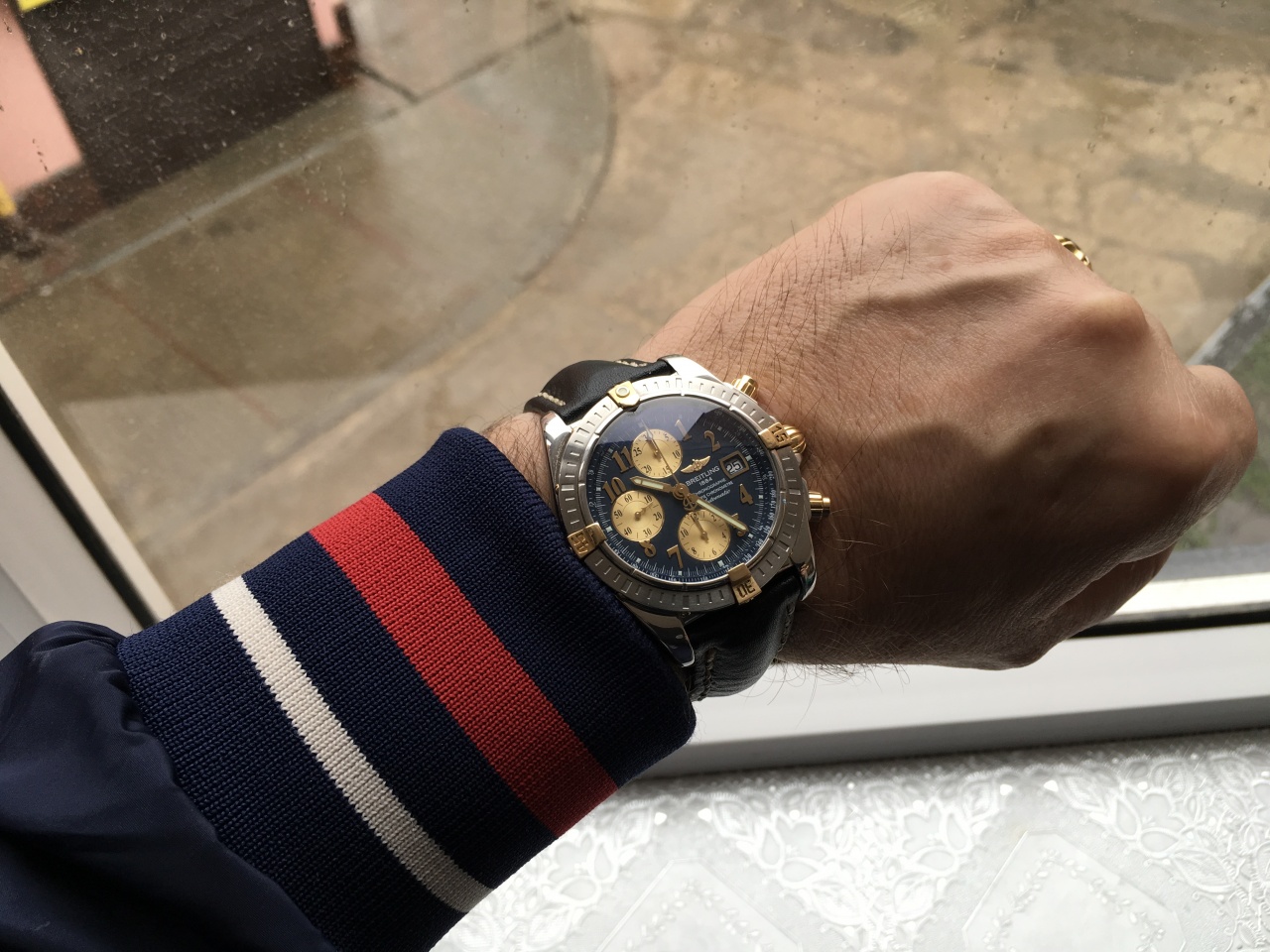 Циферблат - с накладными арабскими цифрами из золота, стрелки - золото, "колодцы" хронографа - золото.