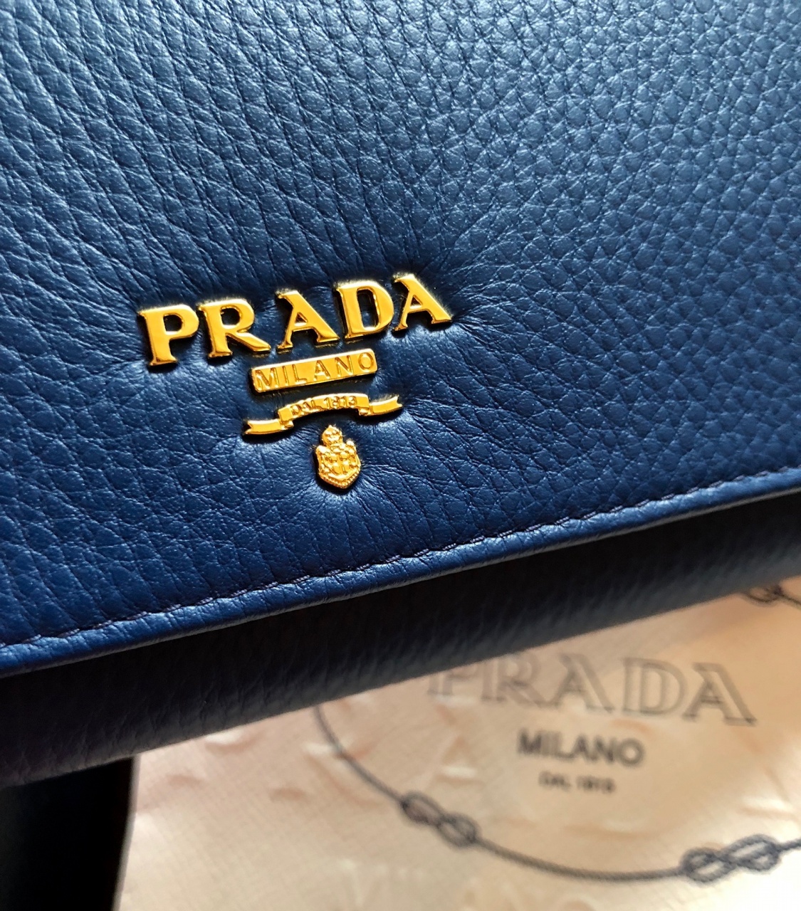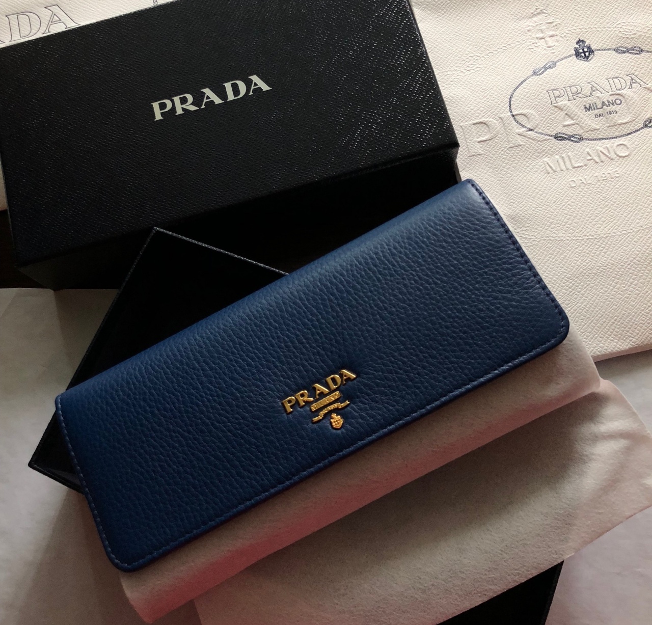 Коллекция 2017-2018 года, со встроенными визитницами, которые у PRADA отдельно стоят не менее 8-12т.р. Мягкая зернистая кожа, выделки VITELLO GRAIN, очень ноская и стойкая к царапинам. Портмоне полноценного формата, 19см на 9,5см. Насыщеного темно-синего цвета Bluette, с золотым металическим лого на клапане.