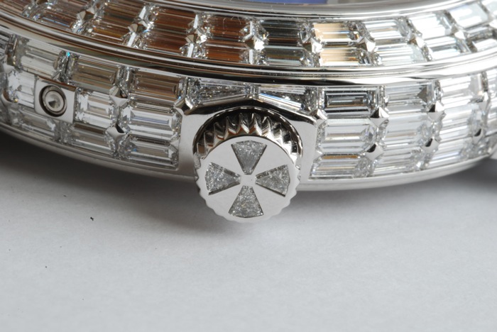 Золотой корпус хронометра украшают 220 бриллиантов в багетной огранке.