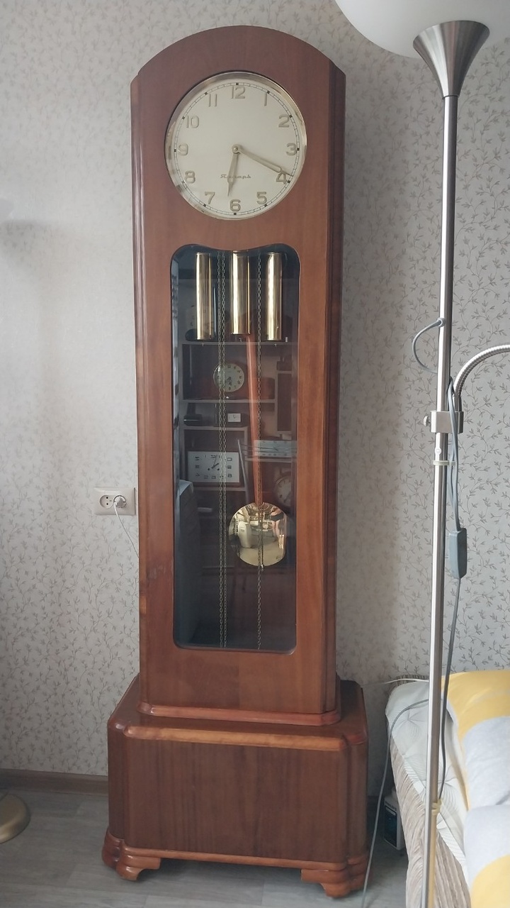 Готовлю авто и бюджет и выезжаю с чувством легкого волнения. Понимаю, что, возможно, и вернусь ни с чем, кроме пробега в оба конца по волжским степям, занявшим почти весь световой день. По прибытии на место увиденное вызвало противоречивые чувства. Часы выглядели не как на фото, а все же более «подзаброшенными». Пыльные, с замечаниями по механизму, скрипящей и клинящей, несколько провисшей дверцей, потертостями лака на корпусе, они буквально молили о помощи. Но, при всем этом – оказались вполне комплектными, при стеклах и всей арматуре, а главное - способными жить. И даже все стержни гонгов на месте и звучат, и пендельфедер живой и что и откручено из крепежа – все как посеянное: на дне тумбочки лежит, в ожидании. И даже гири, и стрелки с цифрами, линза маятника – не почерневшие и без вмятин/забоин. Реалии переезжающего в далекий южный город продавца и неизбежный по этому поводу бардак «чемоданного настроения» лишь усугубили восприятие увиденного. Это, как и дополнительная его скидка за покупку, в сочетании с сочувствием к предмету былой роскоши и решили в итоге исход волнительной сделки. По словам продавца – часы были ему коллективным подарком от друзей. Но далее, поставленные им в своей биллиардной, они так и не начали ходить дольше, чем попытки в максимум 5 минут. Несколько лет они так и простояли лишь предметом интерьера. А еще «где- то был и паспорт от них, но сейчас вот как-то не нашелся» - в суматохе грядущего переезда. Жаль, конечно, раз так. Документ – это святое, ну да ладно, договорились о том, что вышлет почтой, если только найдет.