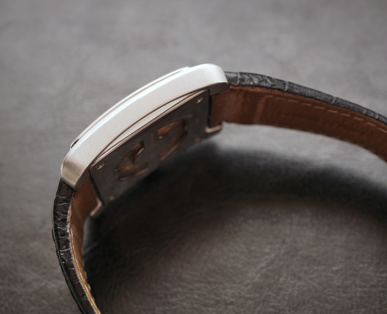 Размеры часов 38x42, толщина составляет всего 9 мм! Форма корпуса слегка изогнута а потому немного «облегает» запястье. Благодаря форме и размерам корпуса часы одинаково хорошо сидят как массивном, так и небольшом запястье. Установлено сапфировое стекло сложной формы - выпуклый прямоугольник. Частично прозрачная задняя крышка декорирована, крепление к корпусу - на винтах. Корпус сатинирован, безель полирован. Могу полирнуть по желанию покупателя, дабы выглядел абсолютно новым. Есть несколько микроцарапинок на задней полированной крышке - естественные следы носки, также могу полирнуть по желанию покупателя.