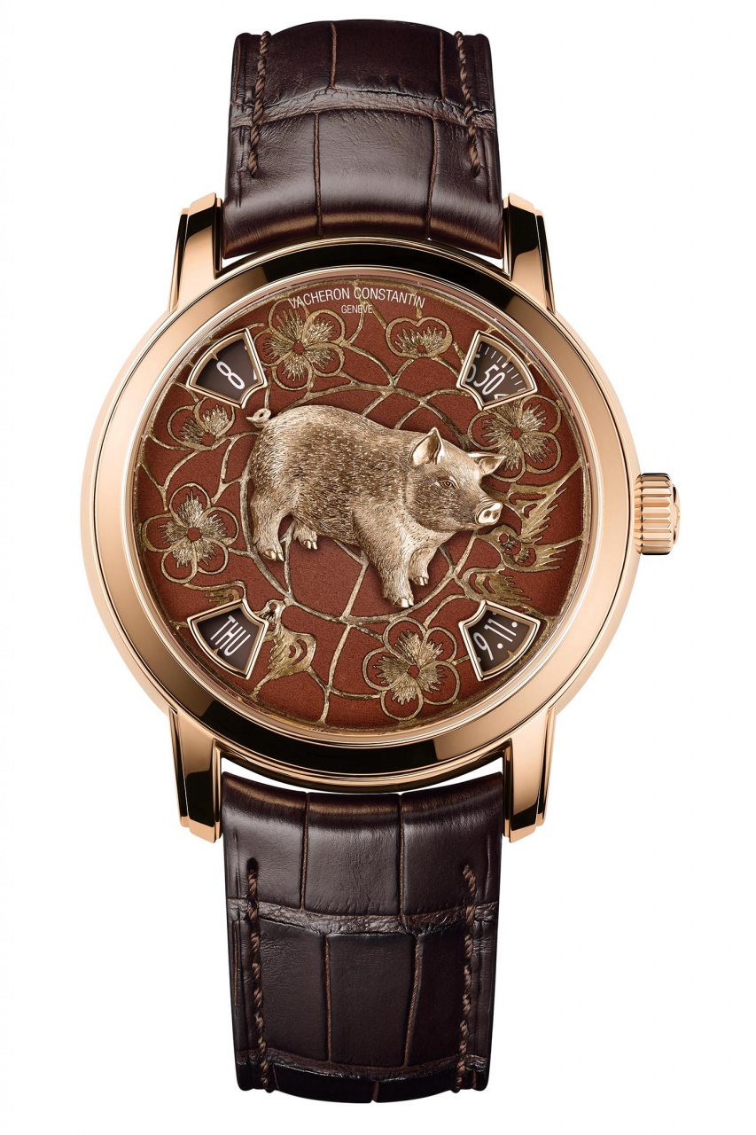 Швейцарская часовая компания Vacheron Constantin выпустила (в составе коллекции Métiers d’Art и линейки Legend of the Chinese Zodiac) свою новую, отмеченную Женевским клеймом ("Hallmark of Geneva"), модель Métiers d’Art The Legend Of The Chinese Zodiac – Year Of The Pig ("Год Свиньи"), которая выпущена в двух вариантах: в платине 950 (Ref. 86073/000P-B428) и в 18-каратном розовом золоте (Ref. 86073/000R-B429). Год Свиньи по китайскому календарю начнется 5 февраля 2018 года.