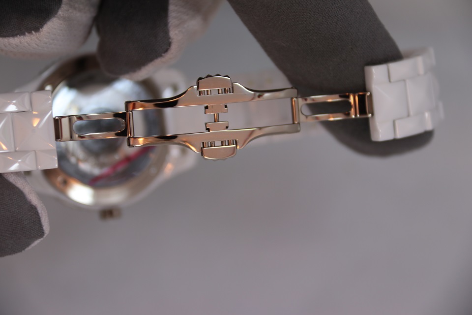 Безель из белого золота украшен бриллиантами багетной огранки. Циферблат часов украшен бриллиантами круглой огранки.
