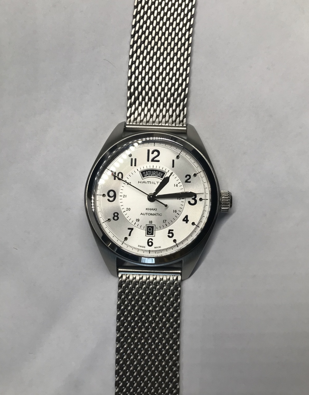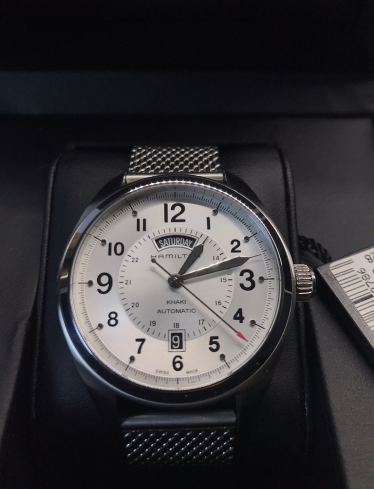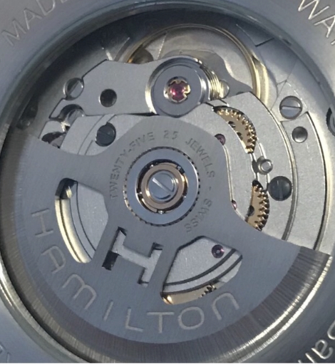 Шикарные Hamilton с усложнением в виде дня недели, по разумной цене. Дата и день недели переводятся мгновенно, не стоит ждать несколько минут и смотреть на вяло ползущую дату. Задняя крышка со вставкой из сапфирового стекла, сквозь которое можно наблюдать за работой шикарного, надежного, точного механизма ETA 2834-2. Корпус часов сатинированный (царапинки не так страшны), безель глянцевый. Внешний круг циферблата имеет гильошь в виде концентричных кругов.