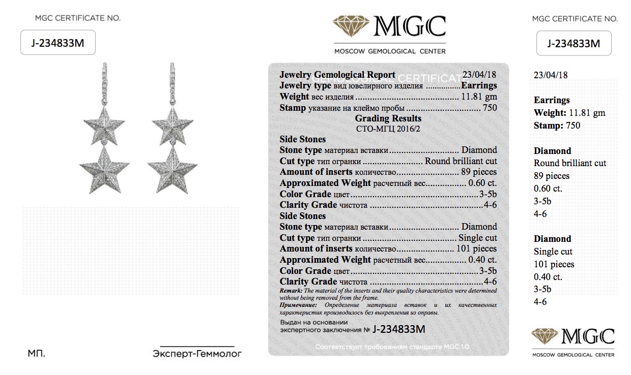 Серьги из белого золота с бриллиантами 1 карат (сертификат МГЦ)