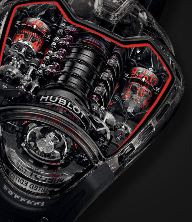 Футуристичный облик модели, как и прежде отсылает к оформлению спорт-кара Ferrari. Он — результат совместного творчества ведущего дизайнера Ferrari Флавио Манцони (Flavio Manzoni) и специалистов Hublot.