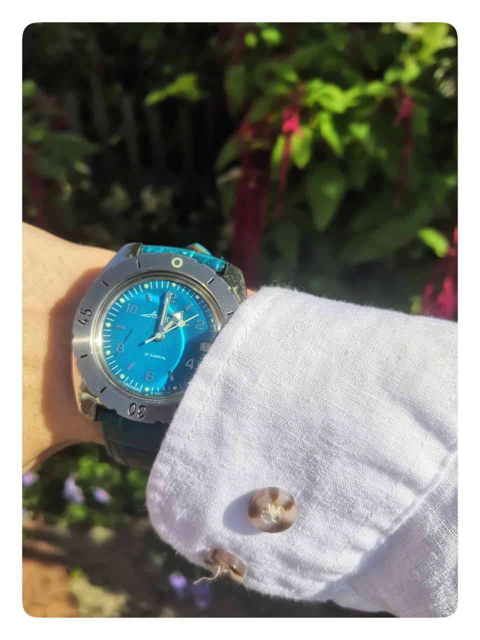 Не могу оторваться от игры циферблата на солнце. При комнатном освещении кажется, будто он монотонно-бюрюзовый, но при солнечных лучах раскрывается легкая игра перламутра. Фантастически дополняет эти часы какой-то совсем уж необычный ремешок. Необычный, потому что такой цвет нужно еще постараться отыскать. Но хорошо, что он шел сразу с часами (плюсы б/у).