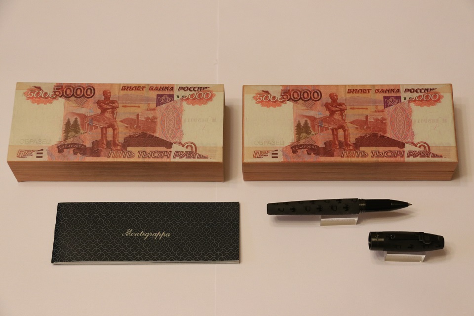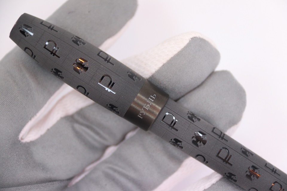 Корпус ручки "Рубль" декорирован симметричным орнаментом из двух символов: знака, обозначающего государственную валюту Российской Федерации, который был официально принят в декабре 2013 года и герба России. Помимо основного символа, исполненного лазерной гравировкой на акриловой смоле корпуса, объемный знак рубля украшает и зажим ручки. Символическая монета 1 рубль украшает верхнюю часть колпачка пишущего инструмента.