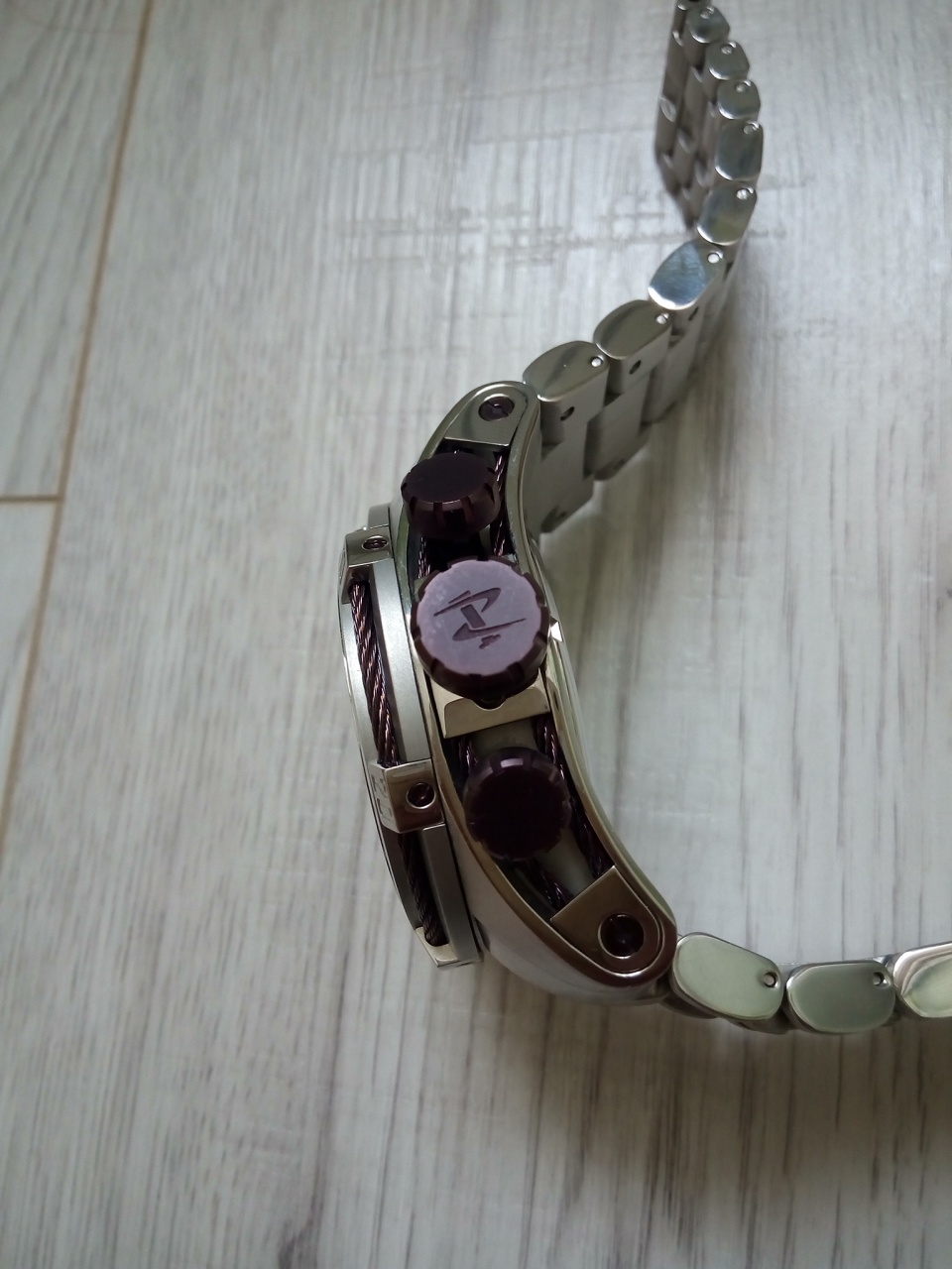 Есть особенность конкретных часов: иногда при откручивании ЗГ сбивается день недели, так как он настраивается кручением в ту же сторону, что и откручивание ЗГ, на функционал никак не влияет, все равно, если часы встали и вы откручиваете ЗГ, то будете подводить и дату и день недели. Когда часы идут, то и дата и день недели меняются корректно, хронограф так же без нареканий.