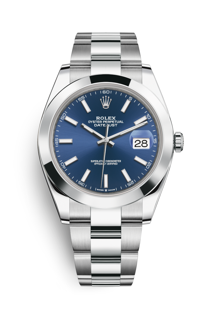 В продаже классическая модель Rolex Datejust 41 mm c циферблатом синего цвета на браслете ойстер.