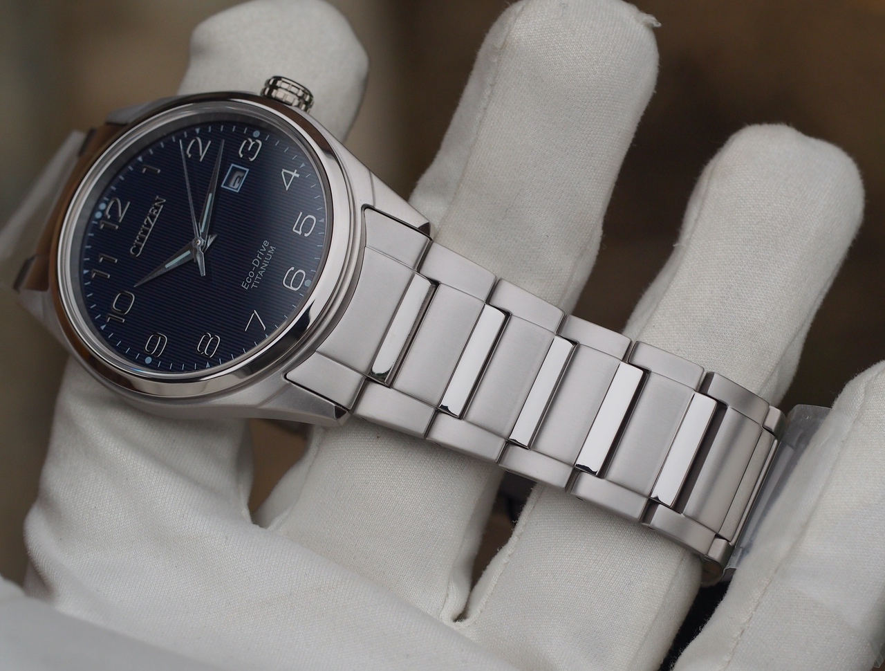 Титановый трехстрелочник с зарядкой от света, синий циферблат в мелкую вертикальную полоску, накладные цифры, спокойный универсальный дизайн