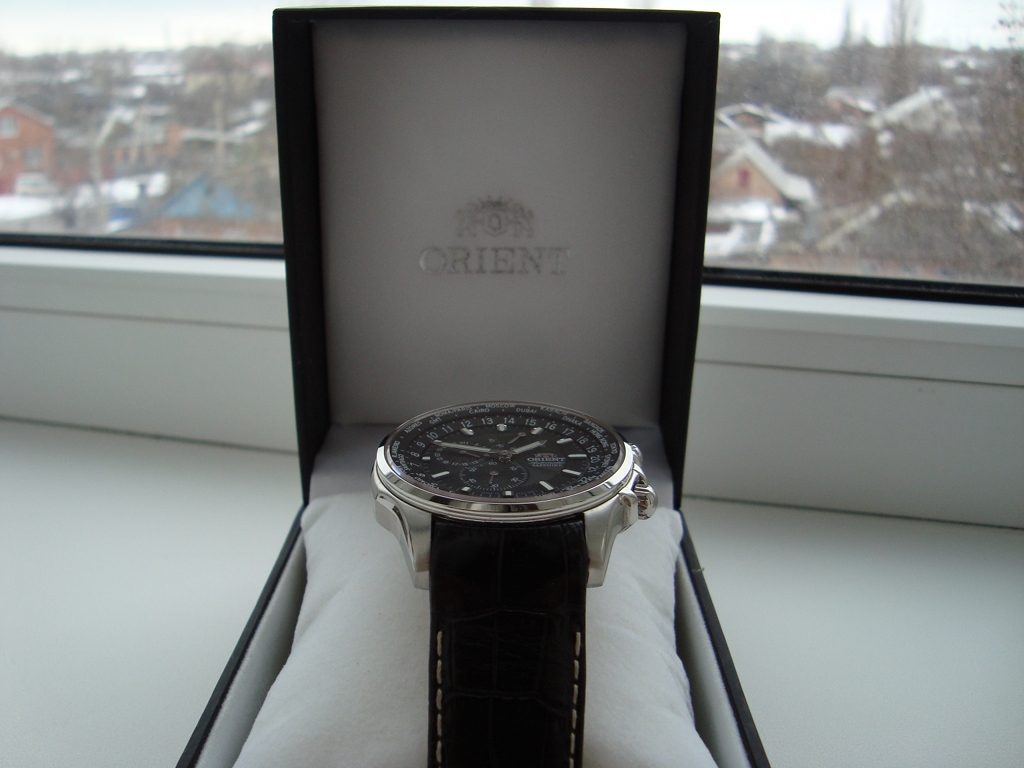 о самих часах. В часах стоит механизм 46H (EY); 23 камня; автоподзавод (ручного подзавода и стоп-секунды нет); плоское сапфировое стекло (какое стекло на задней крышке не знаю); водозащита 100 метров; точность хода, заявленная производителем +25/-15 сек/сутки. Функции - отображение часов, минут, секунд, дата, индикатор запаса хода, мировое время GMT в 24 часовых поясах (по городам). Кожаный глянцевый ремешок чёрного цвета, стилизованный под кожу крокодила. Застёжка "бабочка", что очень удобно.