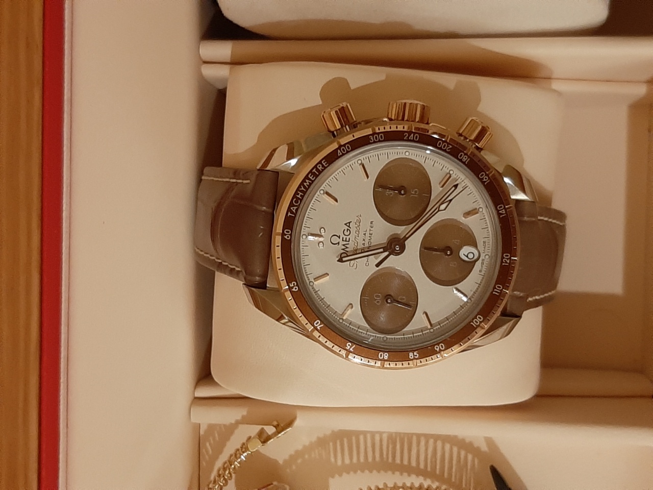 Мне через пару недель перед этим НГ приобрели в похожем стиле Omega Speedmaster Капучино сталь с золотом – это даже не биколор: это реально триколор, если можно так сказать, потому что шкала тахиметра выполнена из алюминия.