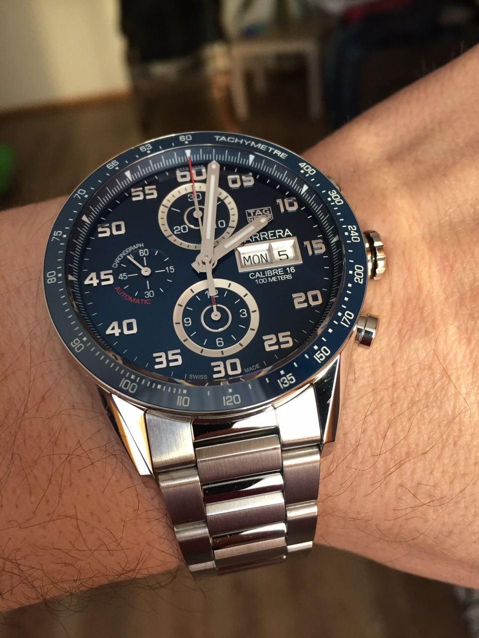 Красивый и очень практичный механический хронограф от Tag Heuer и их культовой линейки CARRERA. Диаметр 43 мм. Синий фейс и синий керамический безель. Смотрятся СУПЕР!!! А в солнечную погоду просто ОГОНЬ!!! Идеальное состояние. Не вскрывались .Не полировались . Одевались несколько раз - так называемую " паутинку" на полированных частях не вооруженным глазом не рассмотреть. Полный комплект. Год покупки 11.06. 2019. Стоимость новых 285 000₽. Часы из личной коллекции поэтому торг минимальный.
