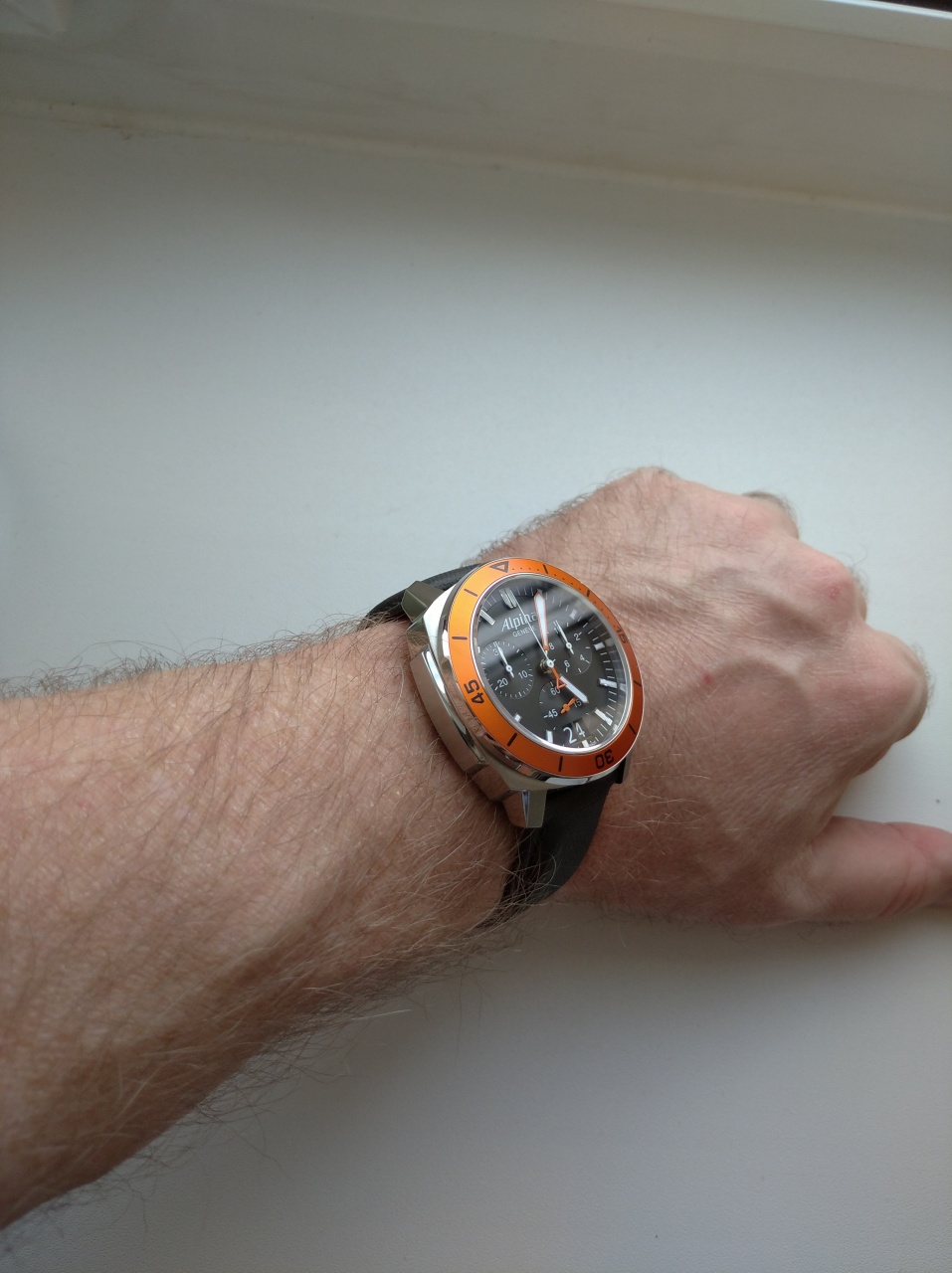 Очень заметные на руке и харизматичные часы с оранжевыми акцентами.