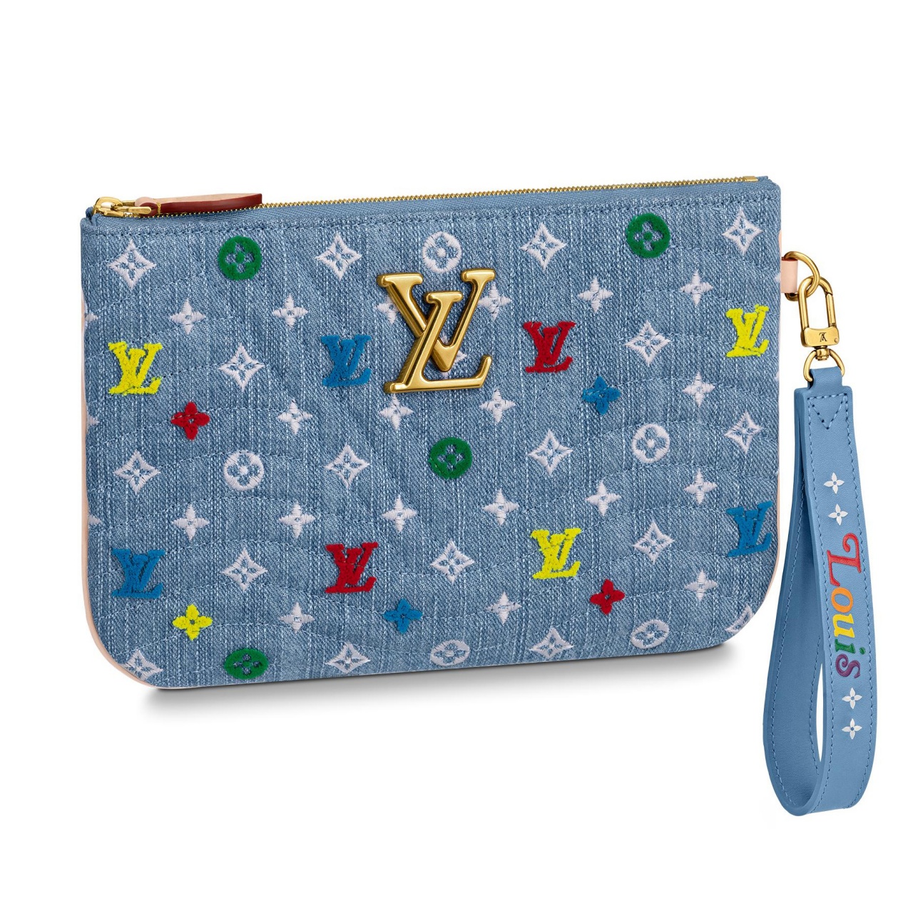 "Эффектный клатч New Wave, представленный в сезонной коллекции LV Denim, выполнен из денима модной винтажной обработки. Волнистые строчки, разноцветная вышивка узора Monogram и фурнитура из золотистого металла — выразительные элементы яркого дизайна. Удобная съёмная ручка украшена красочной подписью Louis Vuitton. Стильный аксессуар гармонично дополнит современный образ."