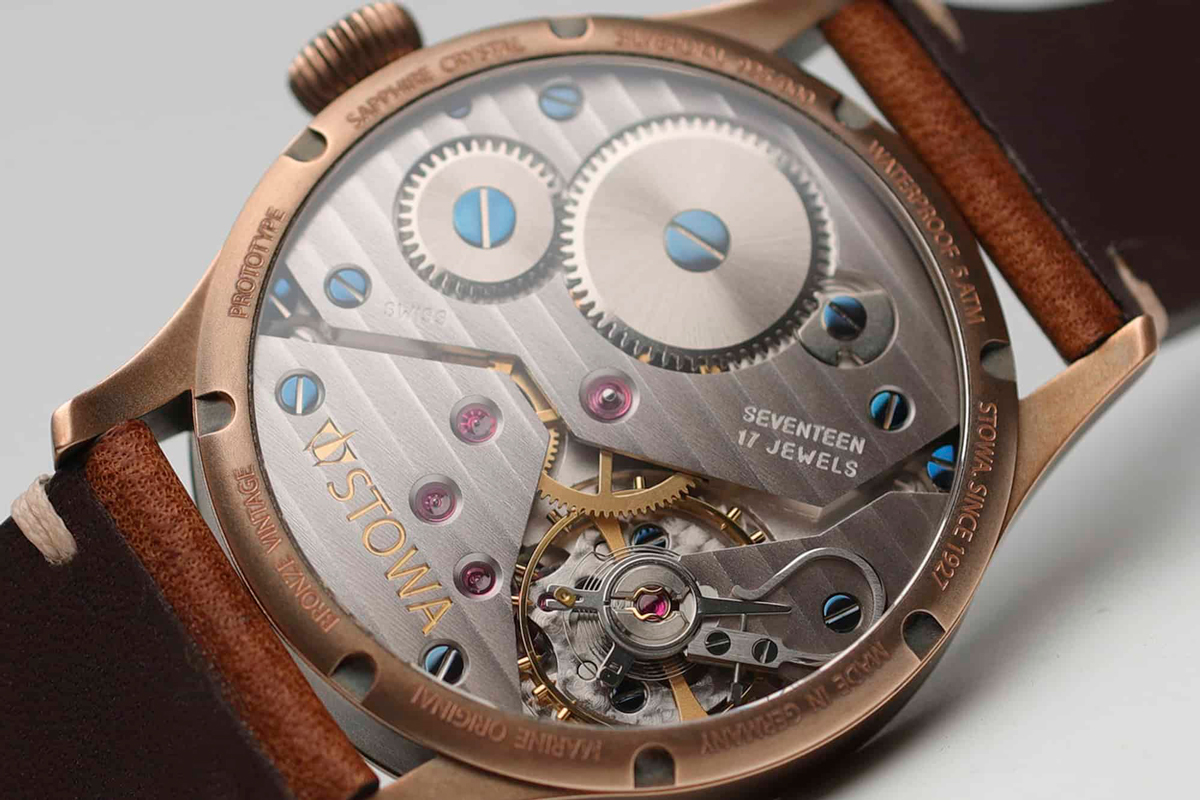 Корпус часов диаметром 41 мм классической для Stowa геометрии выполнен из бронзы и уже имеет предварительное патинирование, которое будет усиливаться со временем. Серебряный циферблат заполнен римскими печатными цифрами. Интересной особенностью являются стрелки – их гармонирующий с корпусом цвет достигается с помощью термической обработки, аналогичной той, которая применяется для термического синения стали.