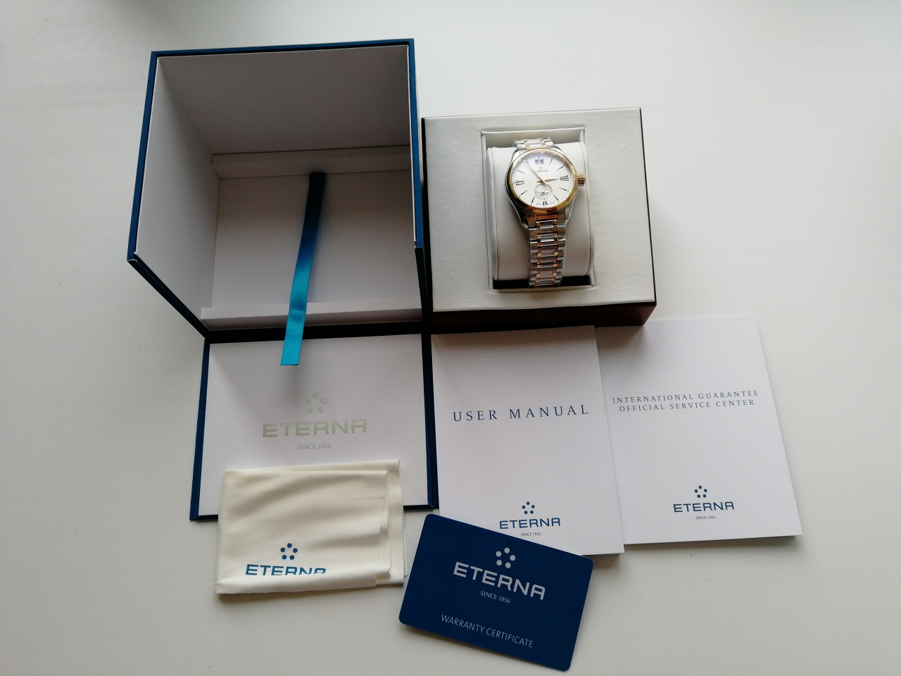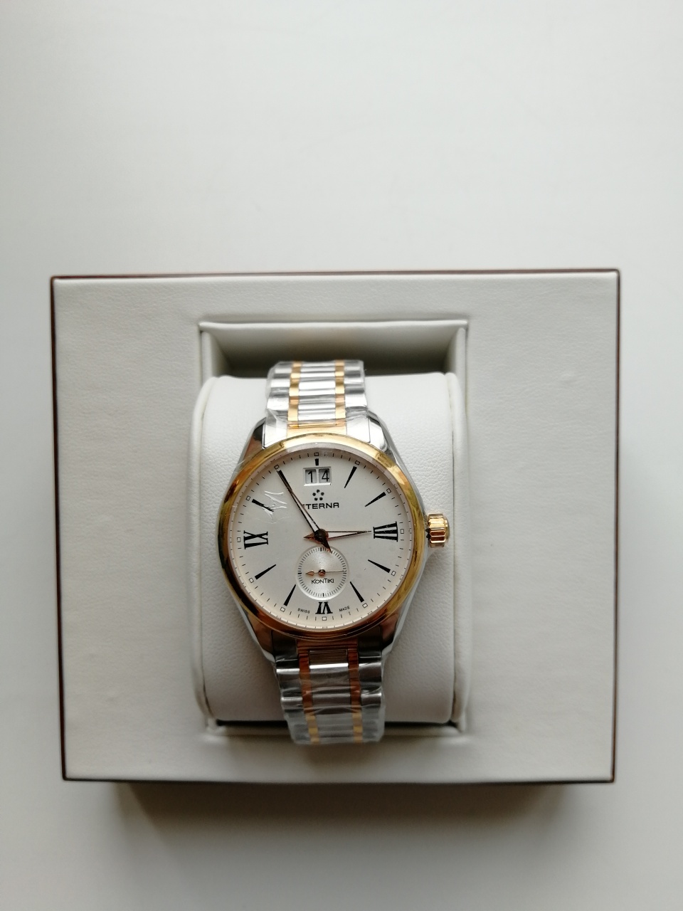 Предлагаю к продаже отличные часы от одного из самых уважаемых швейцарских производителей. Для тех кто не в курсе - Eterna старейший швейцарский бренд с богатой историей, являющийся разработчиком знаменитых механизмов ETA, которые используют ряд производителей, включая люксовых. По мнению экспертов по качеству отделки и внимания к деталям Eterna соперничает со знаменитой Omega! Женская/Unisex модель из знаменитой линейки Kontiki. Ввиду среднего размера и сдержанного дизайна подойдут как женщине, так и мужчине с небольшим запястьем. Замечательные повседневные кварцевые часы. Очень комфортная посадка на руку. Литой браслет высочайшего качества в стиле Eterna Tangaroa. Комбинированный цвет - позолота + нержавеющая сталь. Шикарный циферблат с большим указателем даты и отдельной малой секундной стрелкой. Лучшая отделка в данном ценовом сегменте. Живьём просто бомба - качество полировки, трёхмерность цифера, "игра" меток просто непередаваемы по фото. Идеальное качество полировки и сатинирования, просто без конкурентов в своем ценовом сегменте. Отличная альтернатива избитым Longines и Hamilton! На голову выше Certina, Tissot и им подобным!