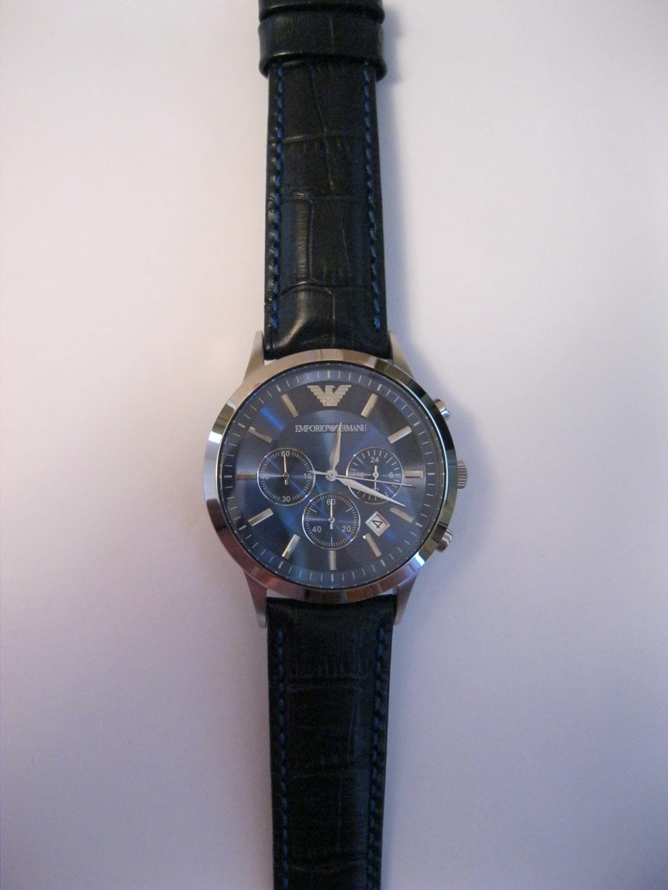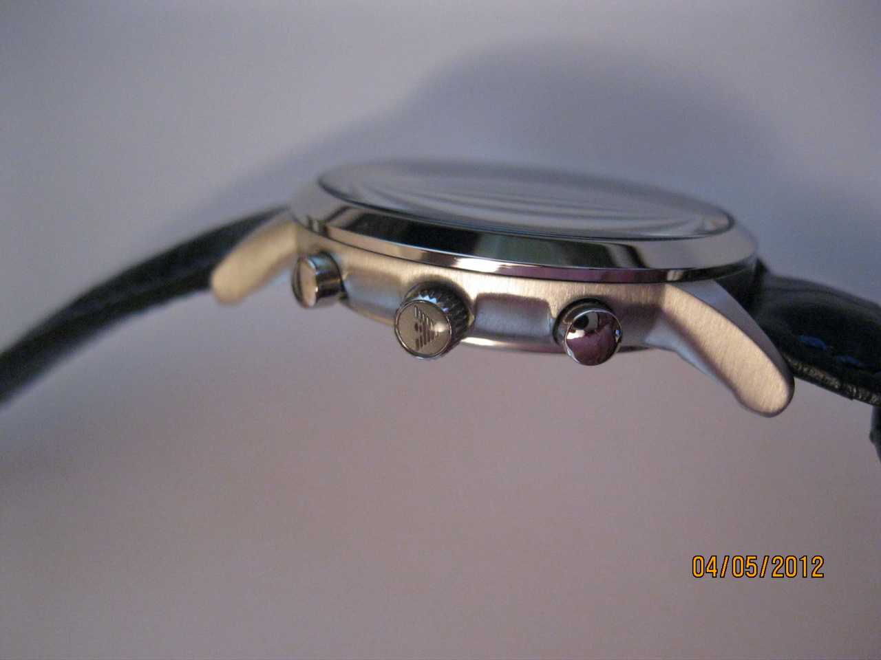 Итак, не хочется вас расстраивать, но похоже у вас подделка, ЗГ - во-первых не должно быть никаких букв ЕА, только орёл (логотип Армани), и только в виде гравировки на металле (конкретно ваша модель), и орёл должен быть маленький (тонкий и чёткий отпечаток), просто есть копии, где он какой то большой на всю головку...