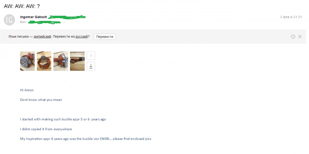 Заметно напряжение. Сравнивает пряжку на моем фото с пряжками МэдДога, предлагает разбираться с МэдДогом, даже умудряется найти какие-то отличия пряжки на моем фото от пряжек МэдДога.
