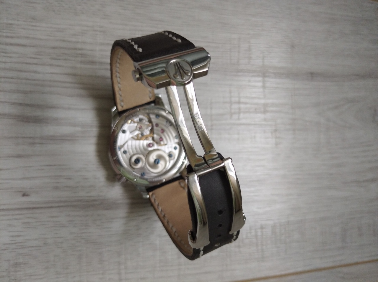 Ремень: пошит новый под заказ под родную раскладную застежку. Мягкий, удобный, темно-серый, под цвет циферблата. Родной ремень, замученный жизнью, тоже имеется