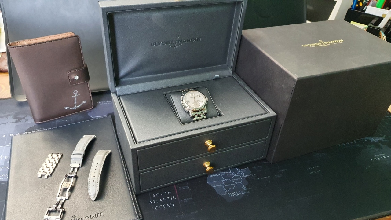 В комплекте: коробка, документы и абсолютно новый оригинальный серый ремешок из кожи аллигатора с застежкой.
