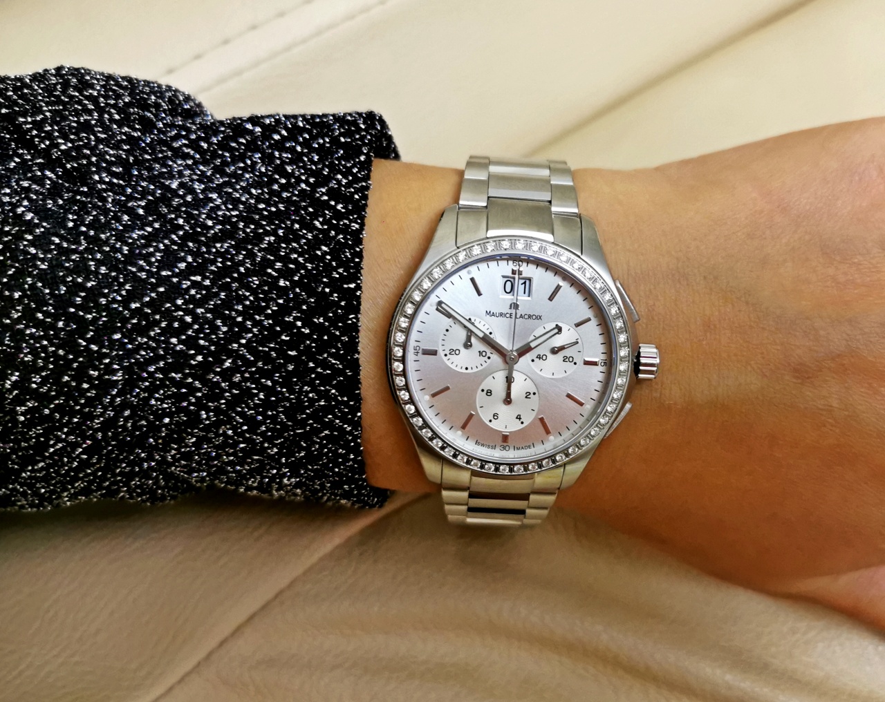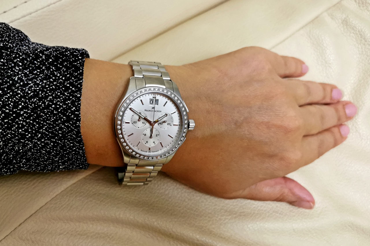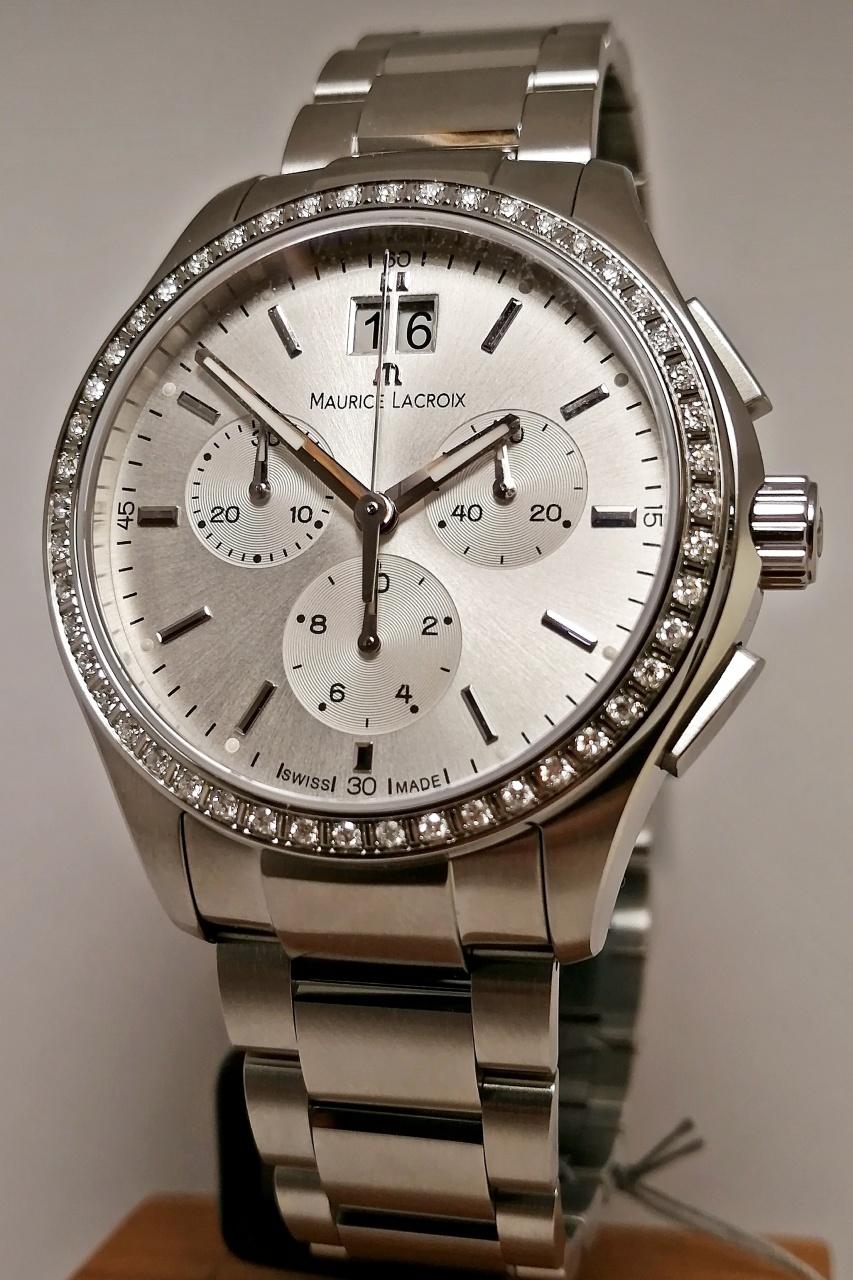 Хронограф от Maurice Lacroix представляет собой идеальное сочетание гармоничного дизайна и совершенного технического оснащения. Часы произведены в стальном корпусе размером 38 мм. Механизм кварцевый, не нуждается в подзаводке и постоянном слежении за точностью. Часы имеют водонепроницаемость 100 м. Серебристый циферблат сатинированный лучами с большой датой закрыт прозрачным антибликовым стеклом из сапфира высокой прочности. Браслет выполнен из нержавеющей стали и комплектуется раскладывающейся стальной застежкой. Корпус инкрустирован 48 бриллиантами весом 0,4855 карата.