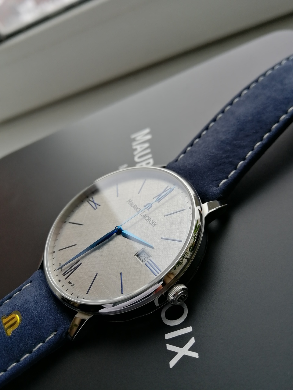 В продаже шикарные и довольно редко встречающиеся классические часы от именитого бренда с очень интересным и запоминающимся дизайном. Серебристый цифер с текстурой похожей на ручное раскрашивание карандашом, синие стрелки, красиво играющие и переливающиеся на солнце, синий кожаный ремешок отличного качества. Цифер смотрится очень богато и необычно. Уровень исполнения и внимания к деталям на высоте. Восторженные и заинтересованные взгляды окружающих обеспечены