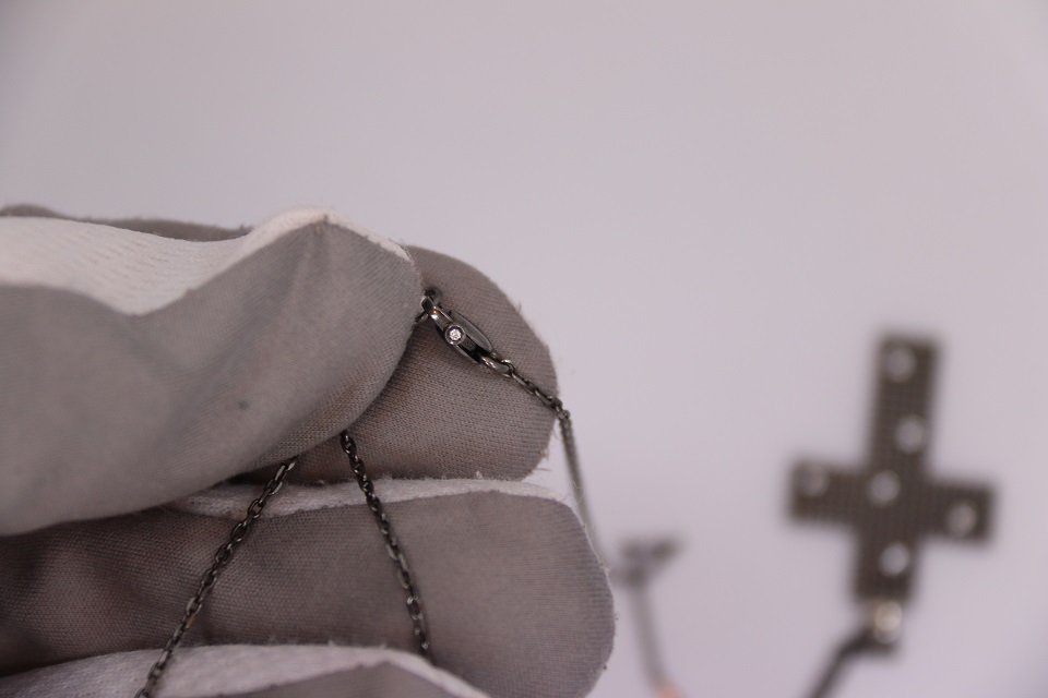 Крест украшен 6 бриллиантами, еще 1 бриллиант находится в застежке.