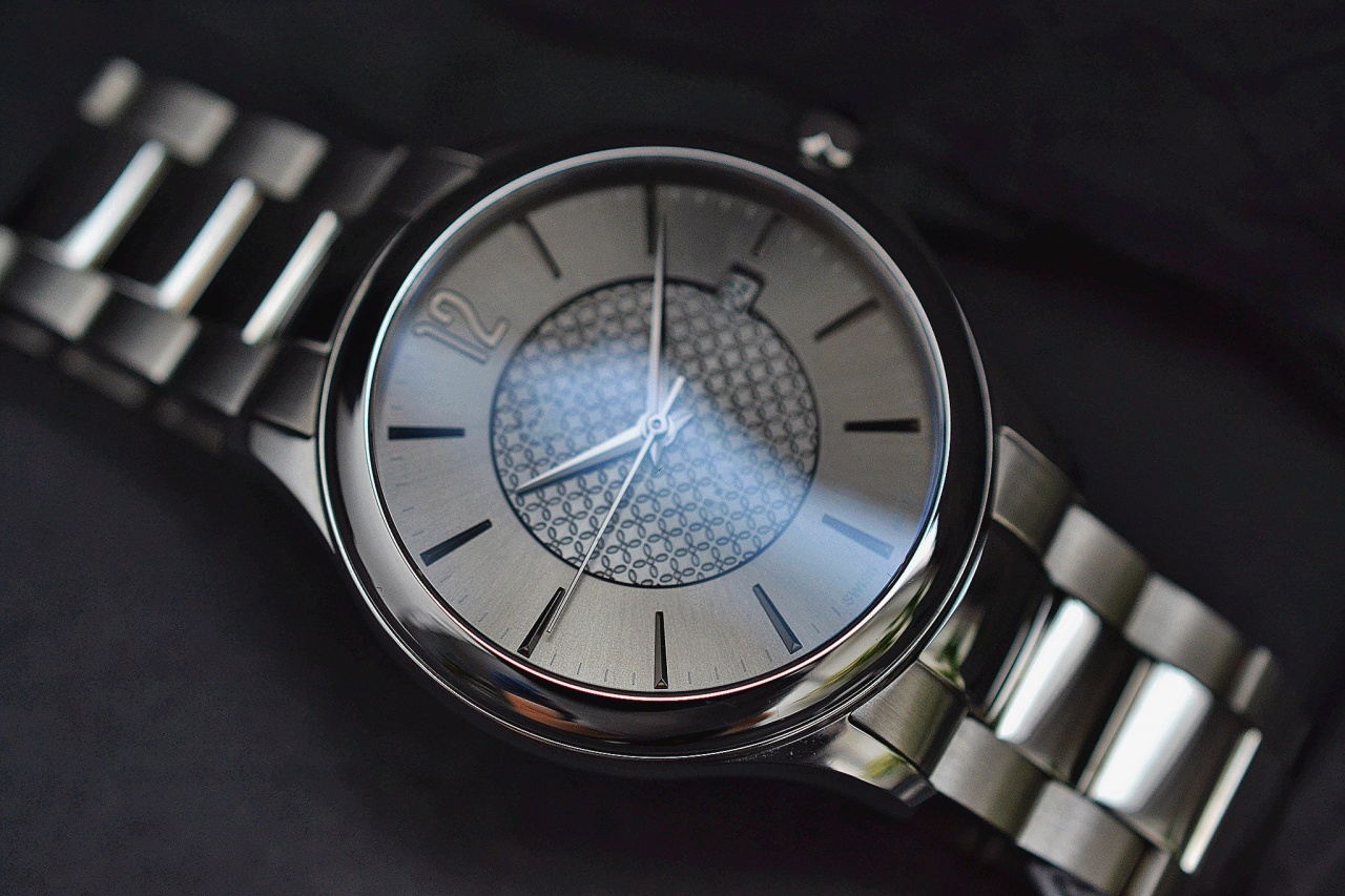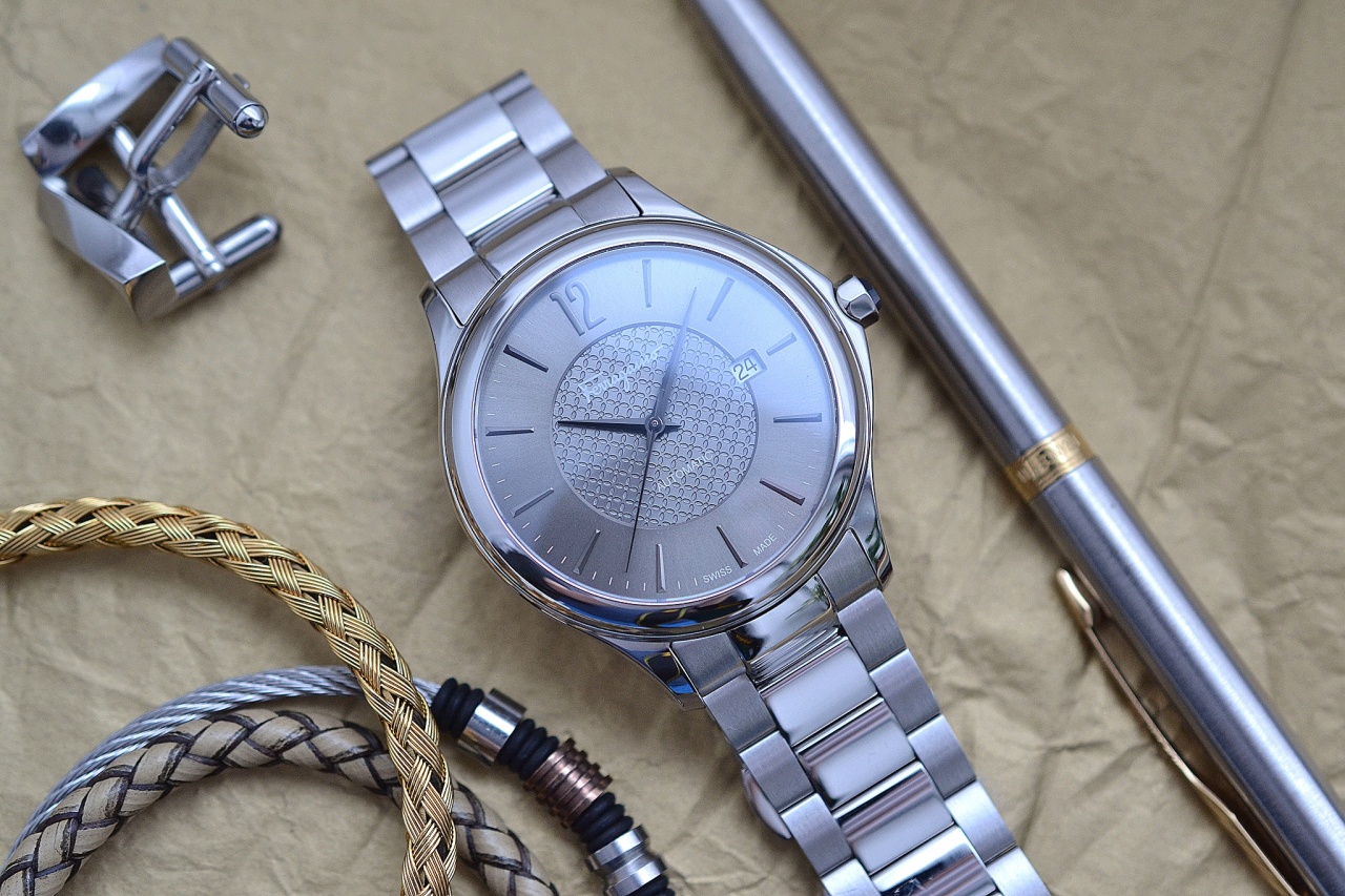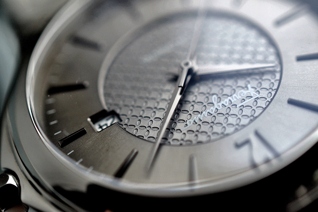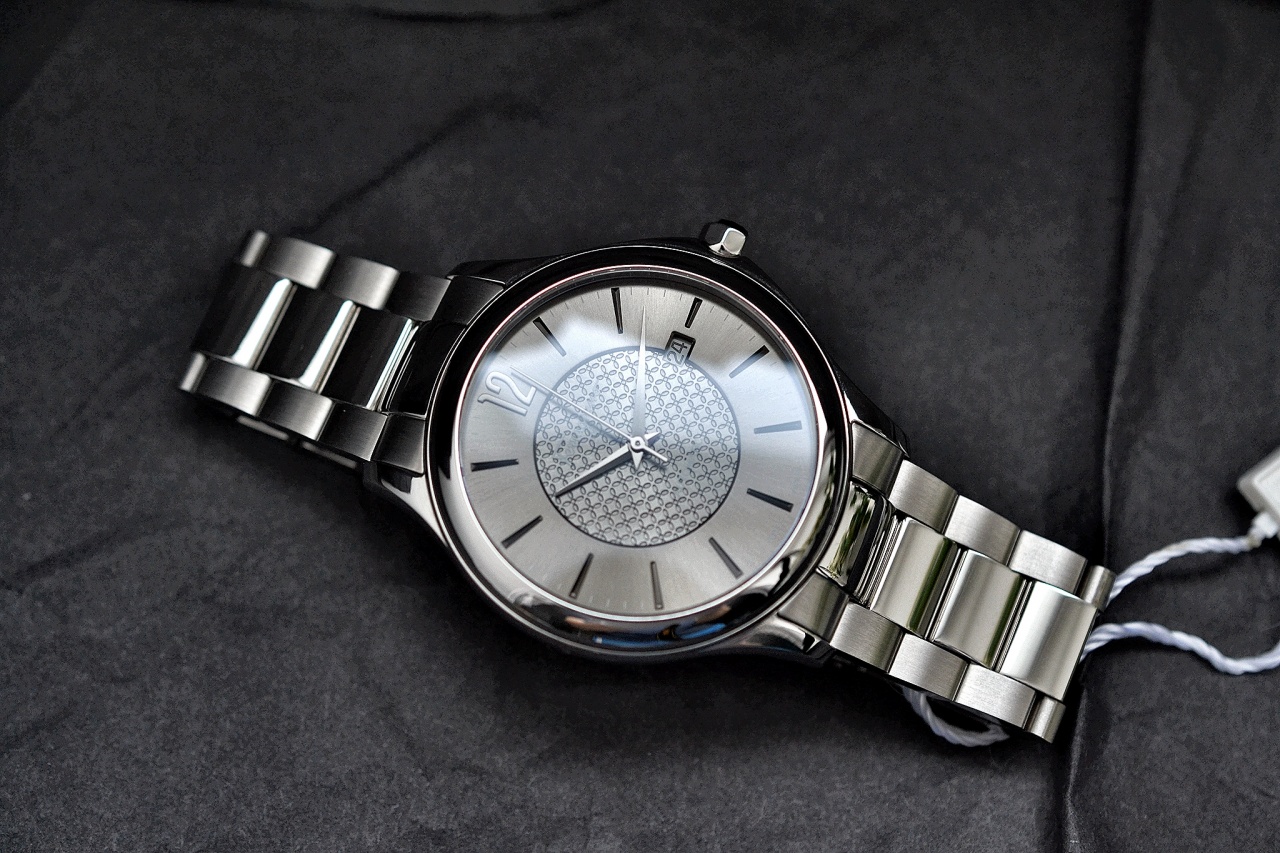 Циферблат серый, темного и светлого тонов, гильшированный узором. Метки и цифры накладные, цифры арабские, темно-серого цвета.